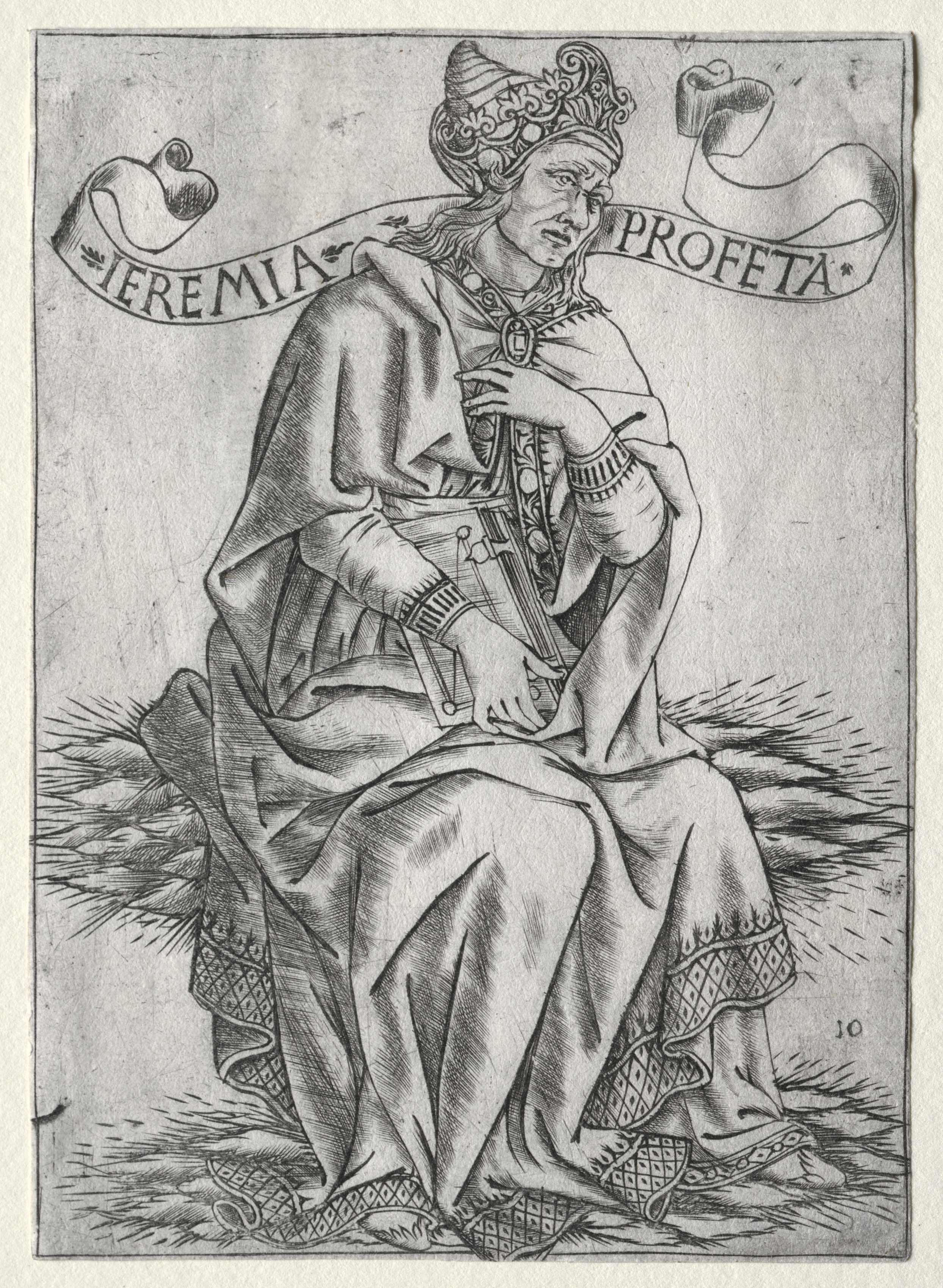 The image depicts Jeremiah, a prophet, sitting on a pile of straw or hay. He wears a long robe with patterned cuffs and hem, and a decorative crown-like hat. His right arm rests on his chest, while his left hand holds a book or scroll. A ribbon banner above him reads "IEREMIA PROFETA". The image is in black and white, with detailed linework and shading. The background is a plain grayish-beige color. Jeremiah's facial expression appears contemplative, and his posture conveys a sense of introspection. The overall style suggests an old, possibly Renaissance-era illustration.