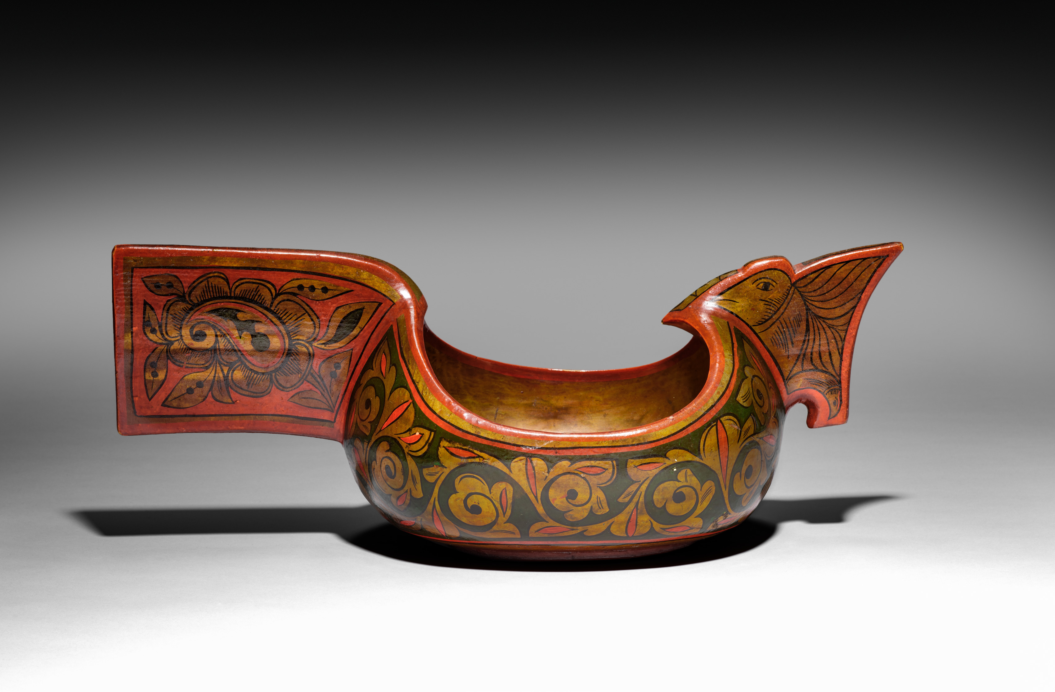 Red and gold painted wooden cup in the shape of a bird, with a curved body and head on the right and a tail on the left, decorated with floral designs and geometric patterns.