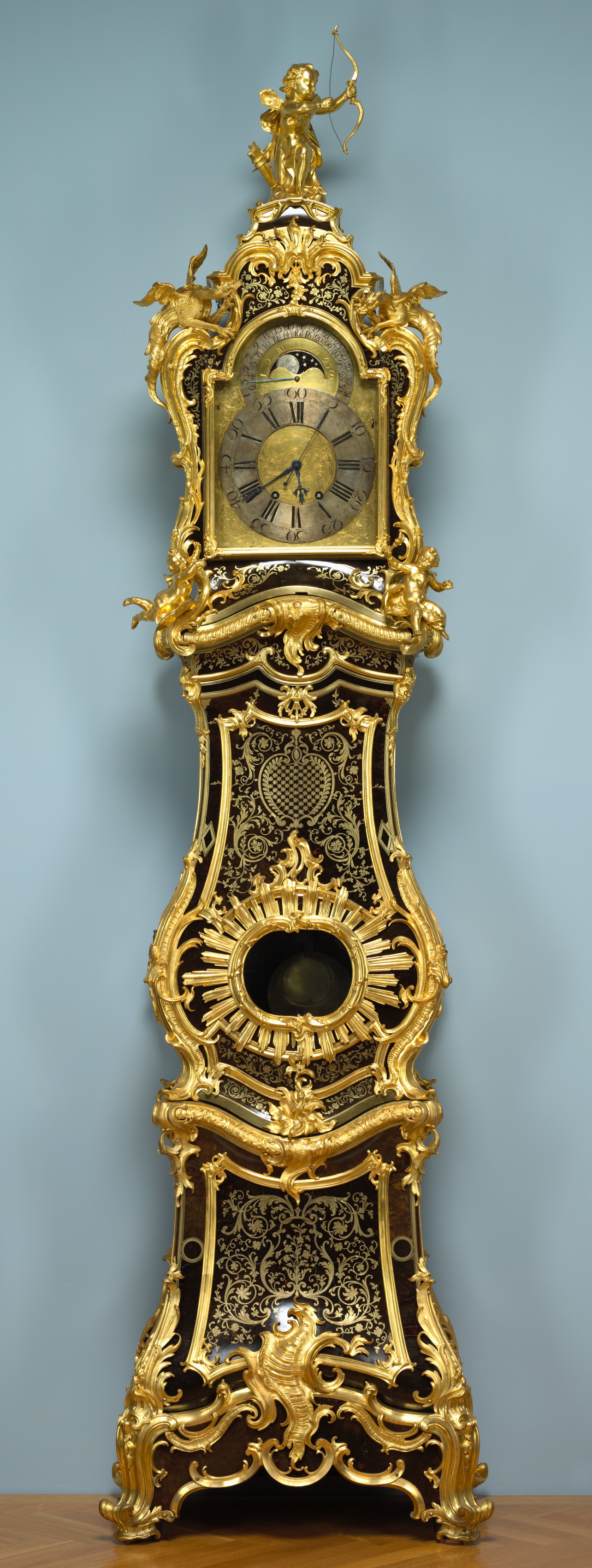 Tall-case clock (Regulateur) by Jean-Pierre Latz: A gold-colored, ornate clock with a black and gold patterned body, featuring a central oval opening on the lower half. The upper half has a clock face with Roman numerals and a sun design. A gold figure of a man with a bow and arrow sits atop. The clock has gold accents and decorations, including a dragon and other animals. It sits on a wooden surface against a blue wall.