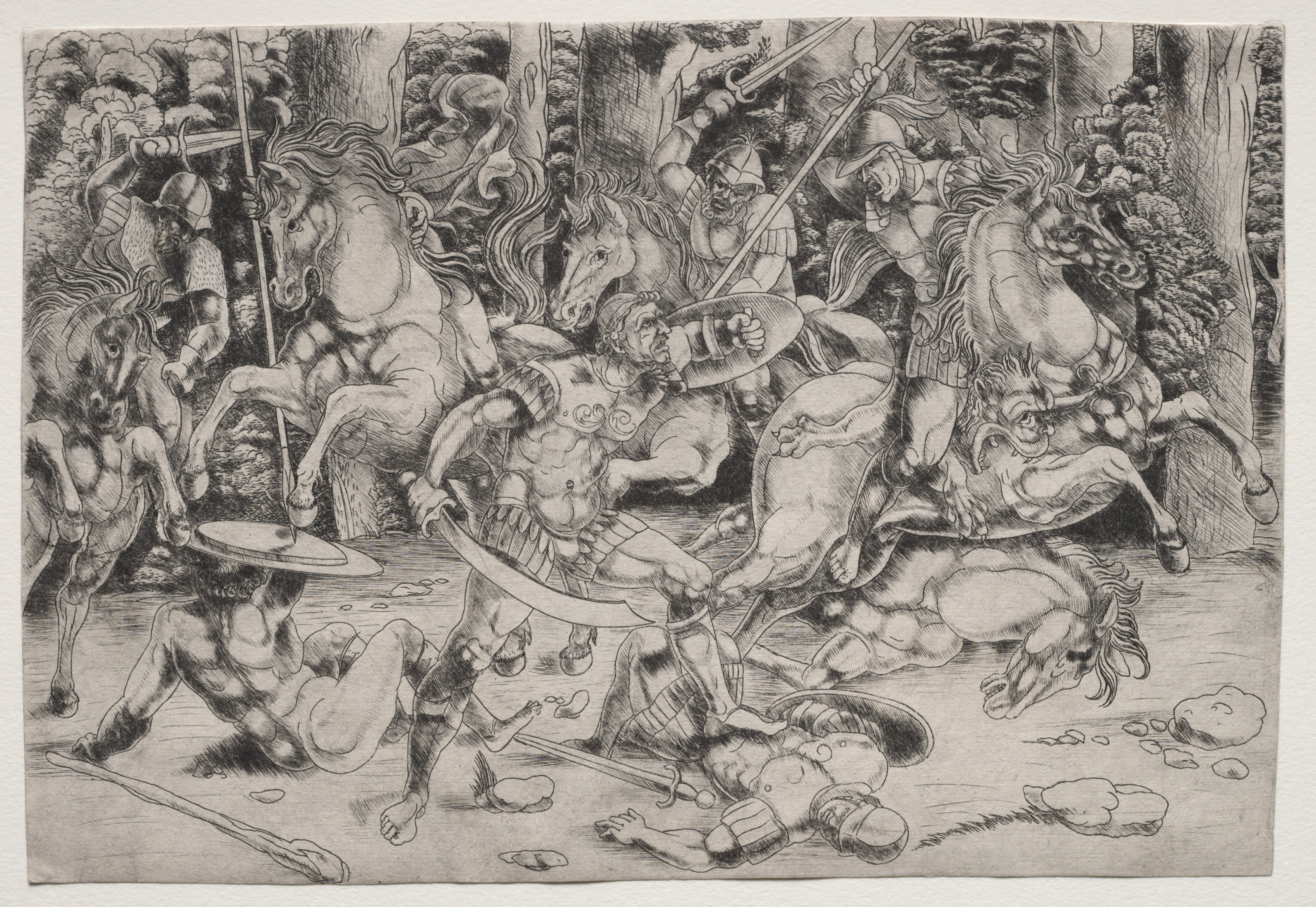 Black and white drawing of a chaotic battle scene. Several armored men on horseback and on foot are engaged in combat. The men on horseback have long hair, wield swords, and wear armor with a plume on their helmets. The men on foot are semi-nude, muscular, and wield clubs. The men on foot are positioned on the left and center of the image. One man on foot with a club lies on the ground in the center. The background features trees and foliage. The composition is dense with overlapping figures and dynamic movement. The style is detailed with shading and texture. The scene depicts a woodland battle between armored warriors and club-wielding, muscular men.