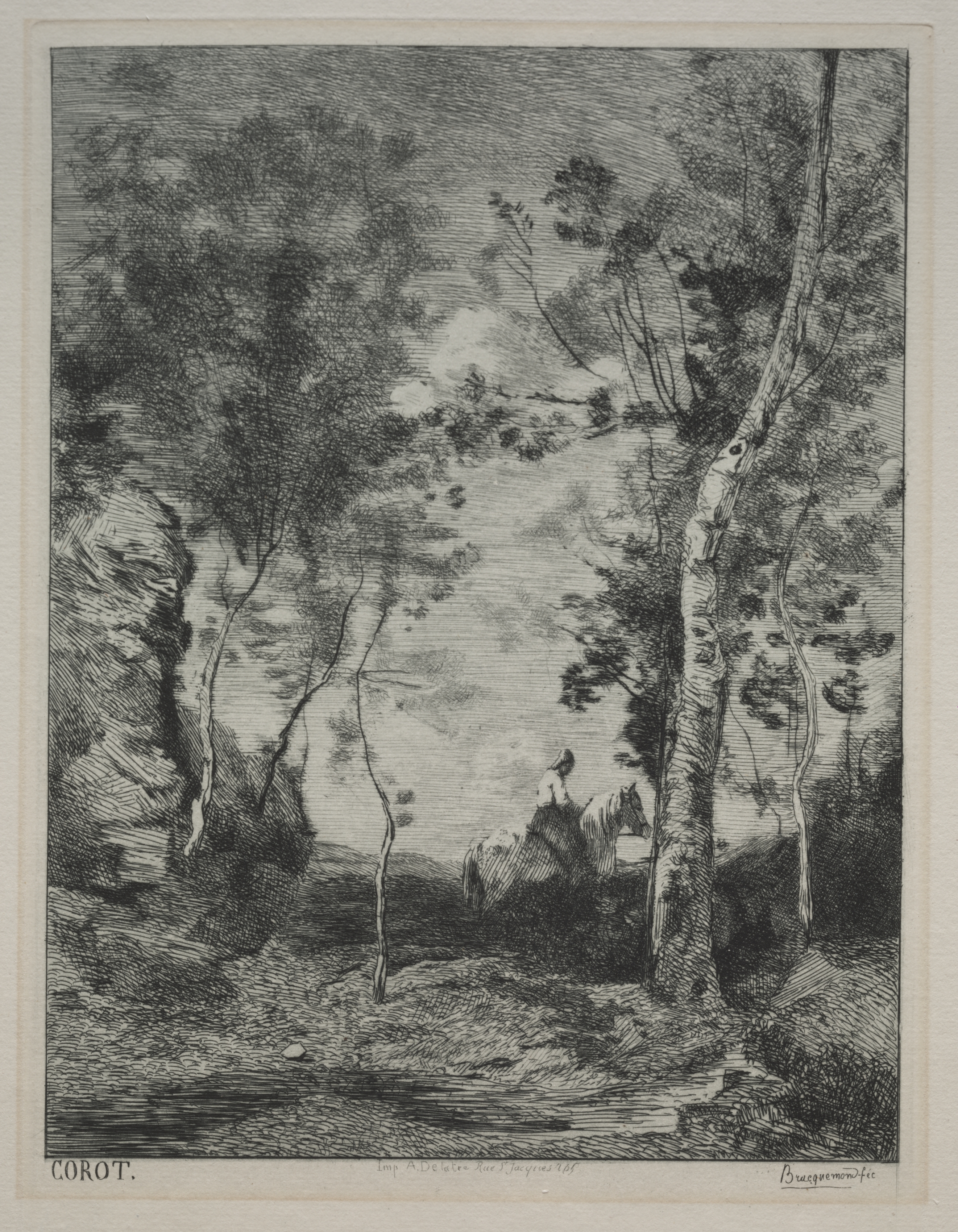 Black and white landscape etching. A forest scene with numerous trees. River or stream present. Hills and dark clouds in the background. Two people and a white horse present in the background. The image is rectangular. Border around the image. Text in the lower-left corner reads "COROT." Text in the lower-right corner reads "Bracquemond."