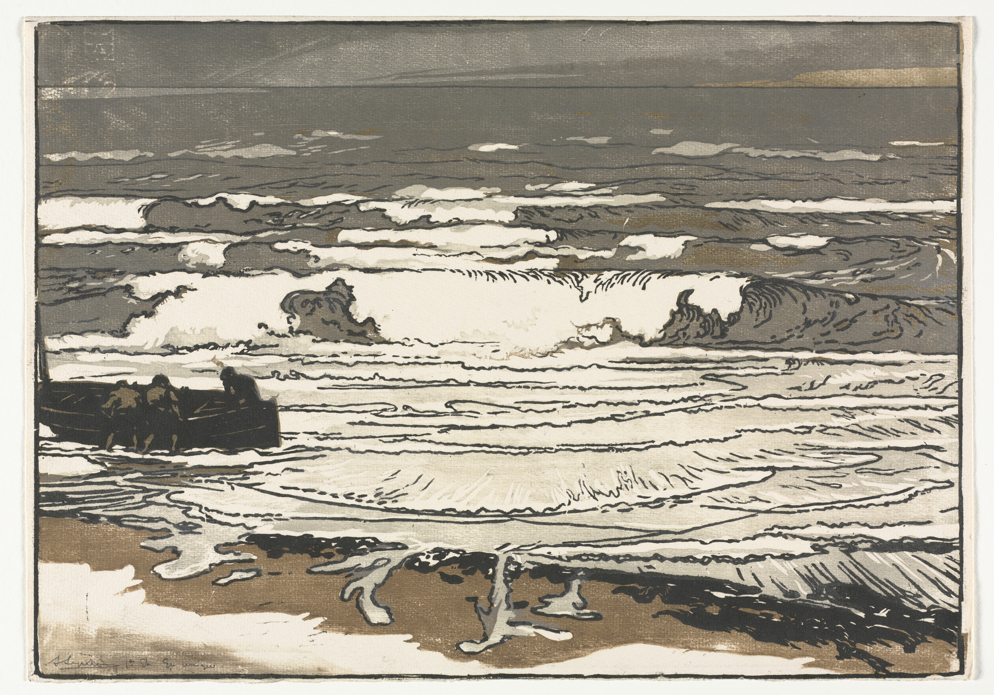 Monochromatic scene of turbulent sea with waves crashing on shoreline; dark brown and gray tones; white foam on waves and shoreline; people in boat on left side; boat partially in water; rough lines and shading; wave crests blown off in wind; dark clouds in background; beach visible in bottom right corner.