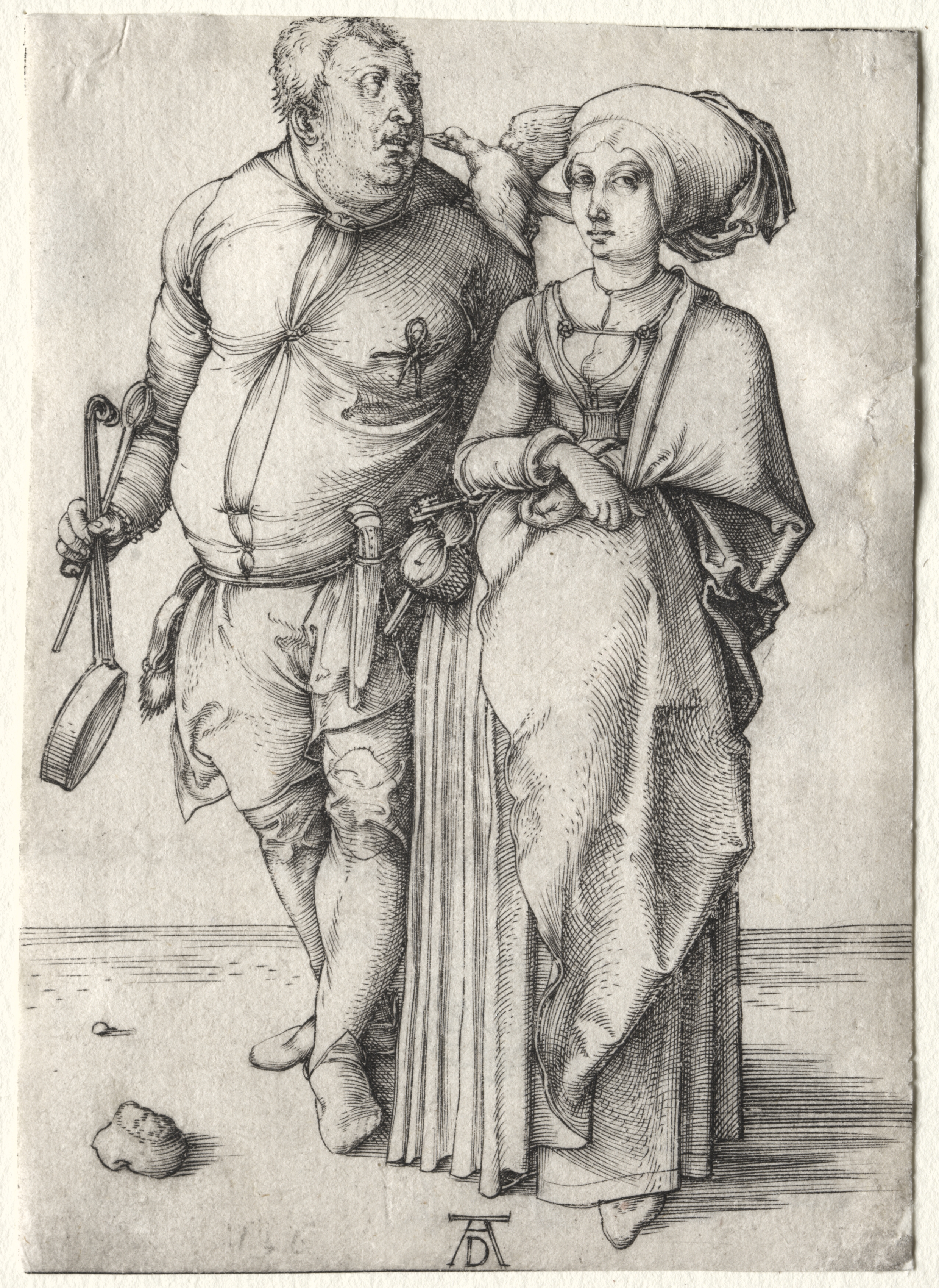 Black and white drawing of a man and woman. The man, on the left, has short curly hair and a protruding belly. He wears a shirt with puffy sleeves and a ribbon tied around his chest. His pants are tied below the knee. He holds a frying pan and spatula in his right hand. His left hand rests on the woman's shoulder. The woman, on the right, wears a long dress and a head covering. Her right arm is bent at the elbow and her left arm hangs down. A small pile of feces and a coin sit on the floor to the left. A signature is at the bottom center.