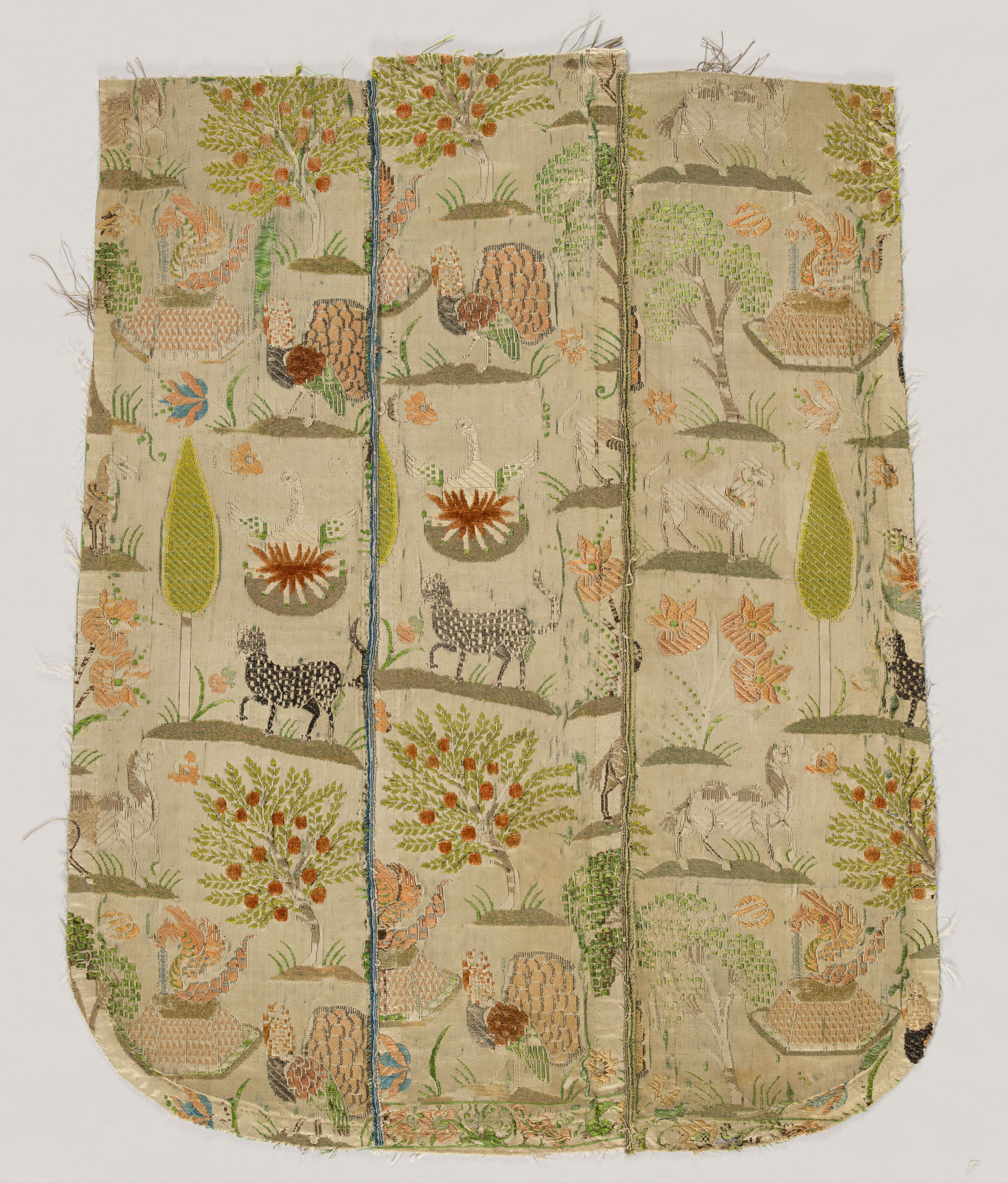 Tan fabric with a pattern of trees, flowers, and animals; fabric is in three pieces sewn together down the middle; edges are frayed. Half Chasuble. Unknown Artist.