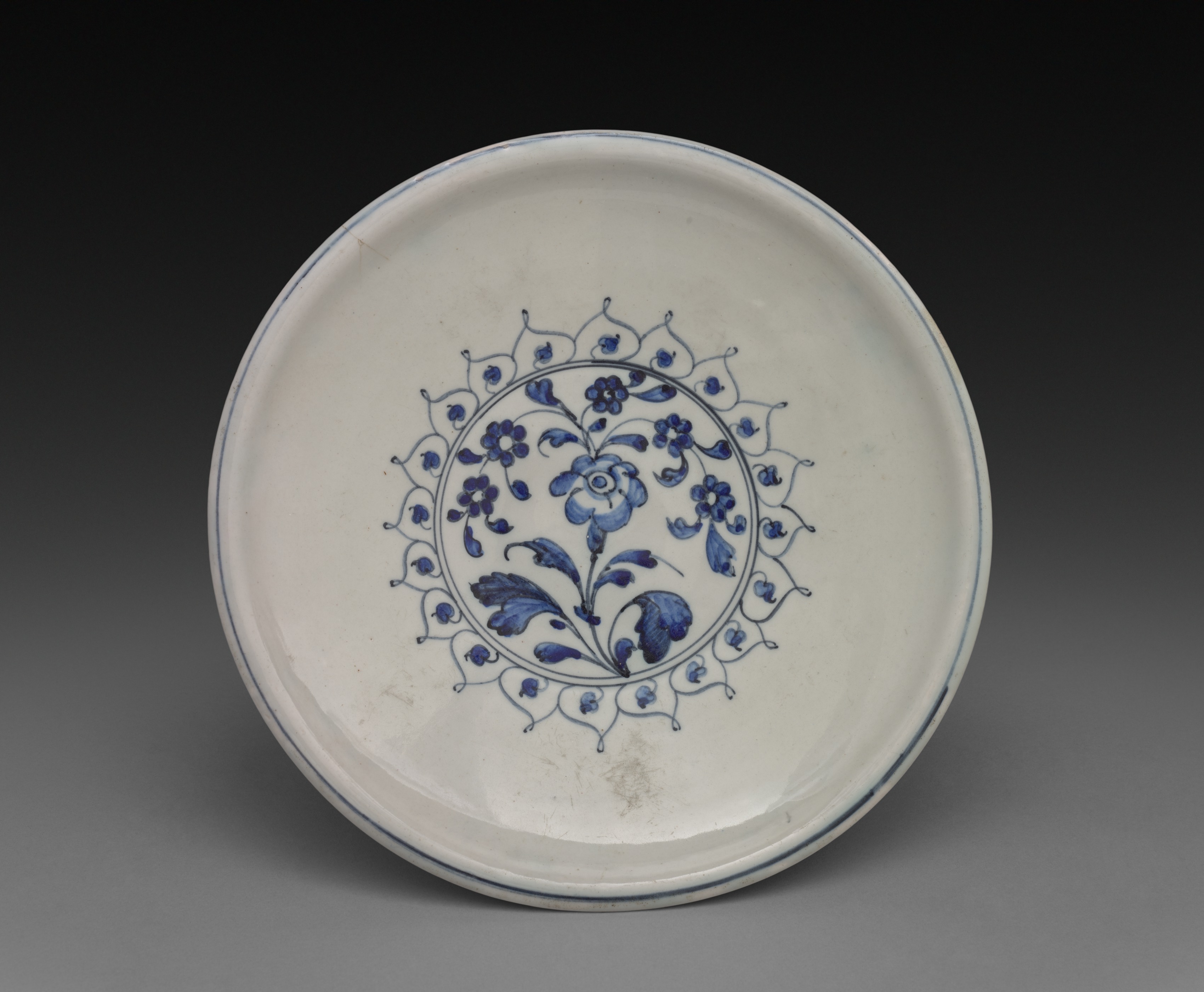 White plate with a blue floral design. The plate is round and shallow with a slightly raised rim. A thin blue line encircles the rim. The floral design is in the center of the plate and consists of a large flower with several smaller flowers and leaves. The design is surrounded by a circle with a pattern of blue shapes resembling leaves or petals. The background of the plate is white, and the design is blue. The plate sits on a gray surface with a black background. The plate by the artist is titled "Plate".