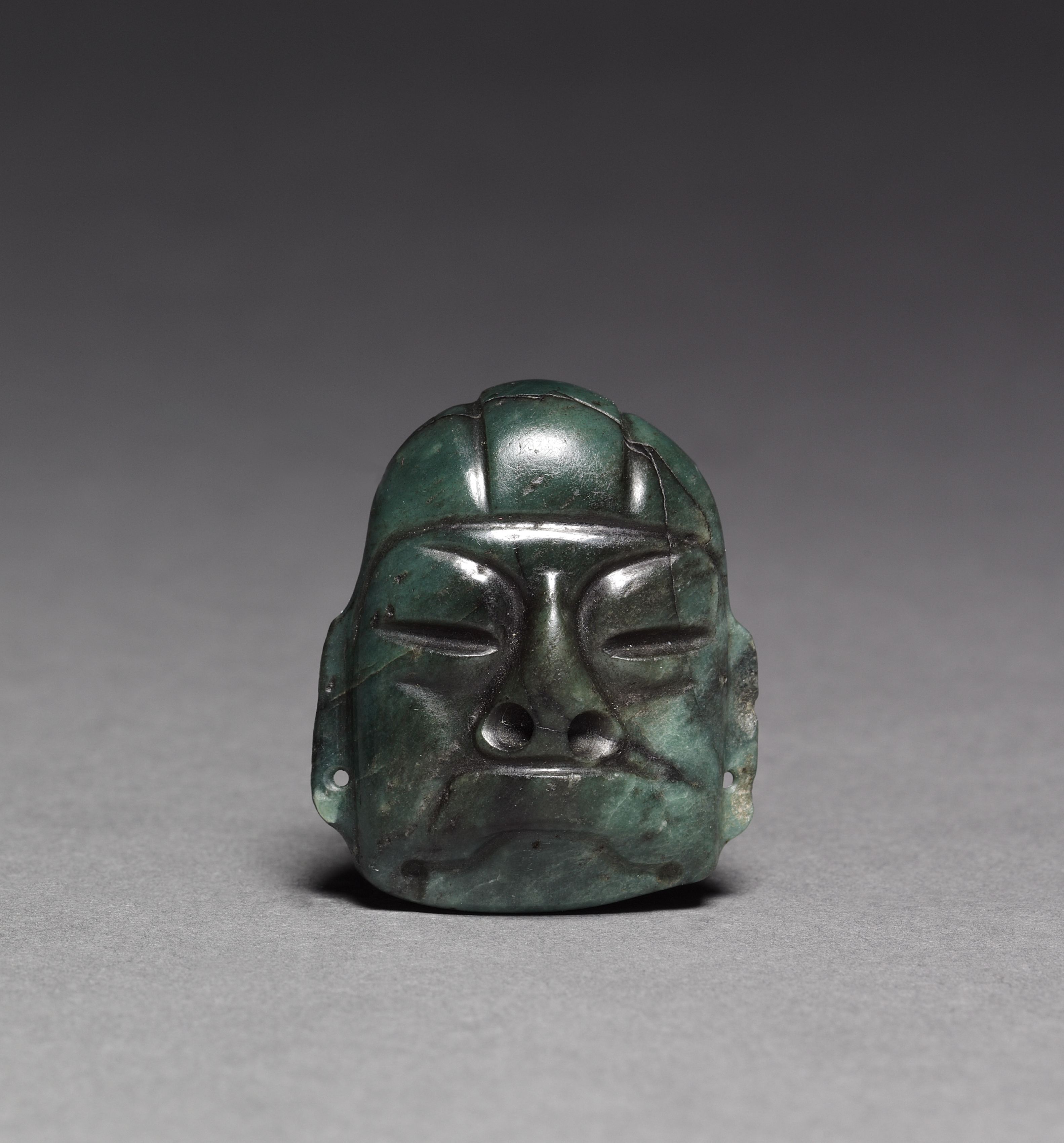 Miniature Mask by unidentified artist. The mask is made of dark green stone, possibly jade. It has a smooth, glossy surface with visible scratches and marks. The mask depicts a human face with closed eyes, a nose, and a mouth. The facial features are carved into the stone, with defined eyebrows, and nostrils. The mask has a small hole on each side, near the ears. The background is gray, with a darker shade at the top and a lighter shade at the bottom. The mask sits on a flat surface.