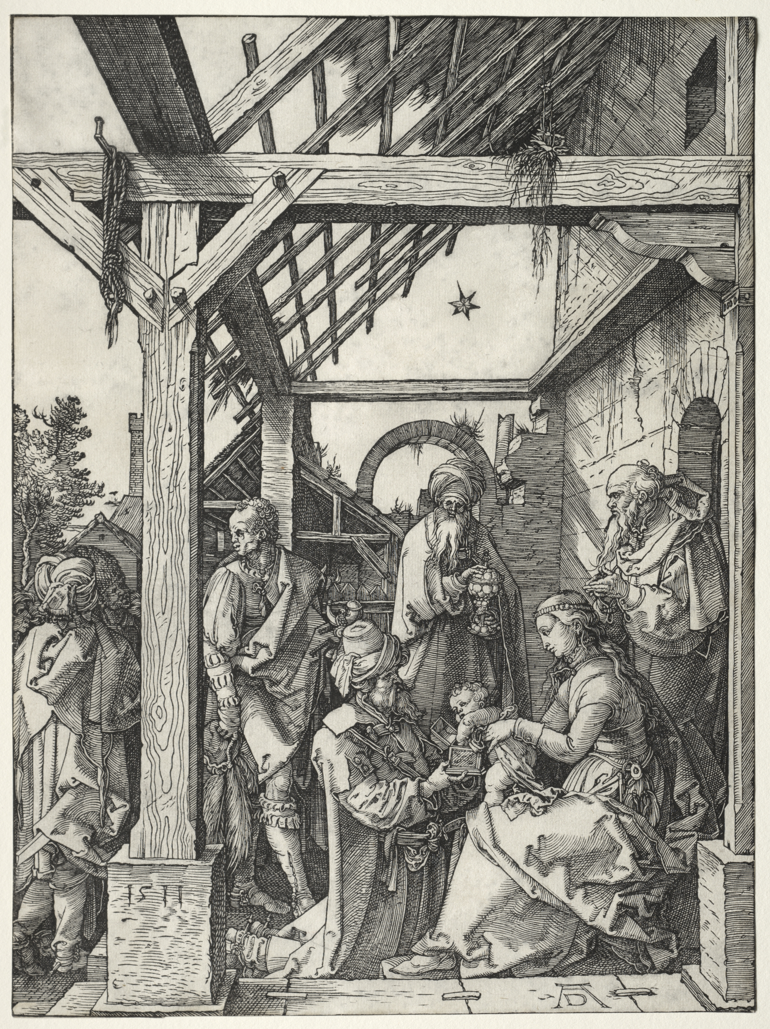 The image depicts a black-and-white drawing of a scene. The scene shows a group of people gathered around a woman sitting on the floor, holding a baby. The woman sits on the right side, wearing a long dress and has long hair. A man stands before her, presenting the baby with an object. Behind them, three men in turbans and robes stand and face each other. One of them holds an object in his hands. On the left side, a man stands, partially out of frame, holding a long object under his arm. In the background, there is an opening showing a roof with a star above, and another building with a roof and chimney. The overall composition is enclosed by a border. The scene is titled "The Adoration of the Magi" and is by Albrecht Dürer.