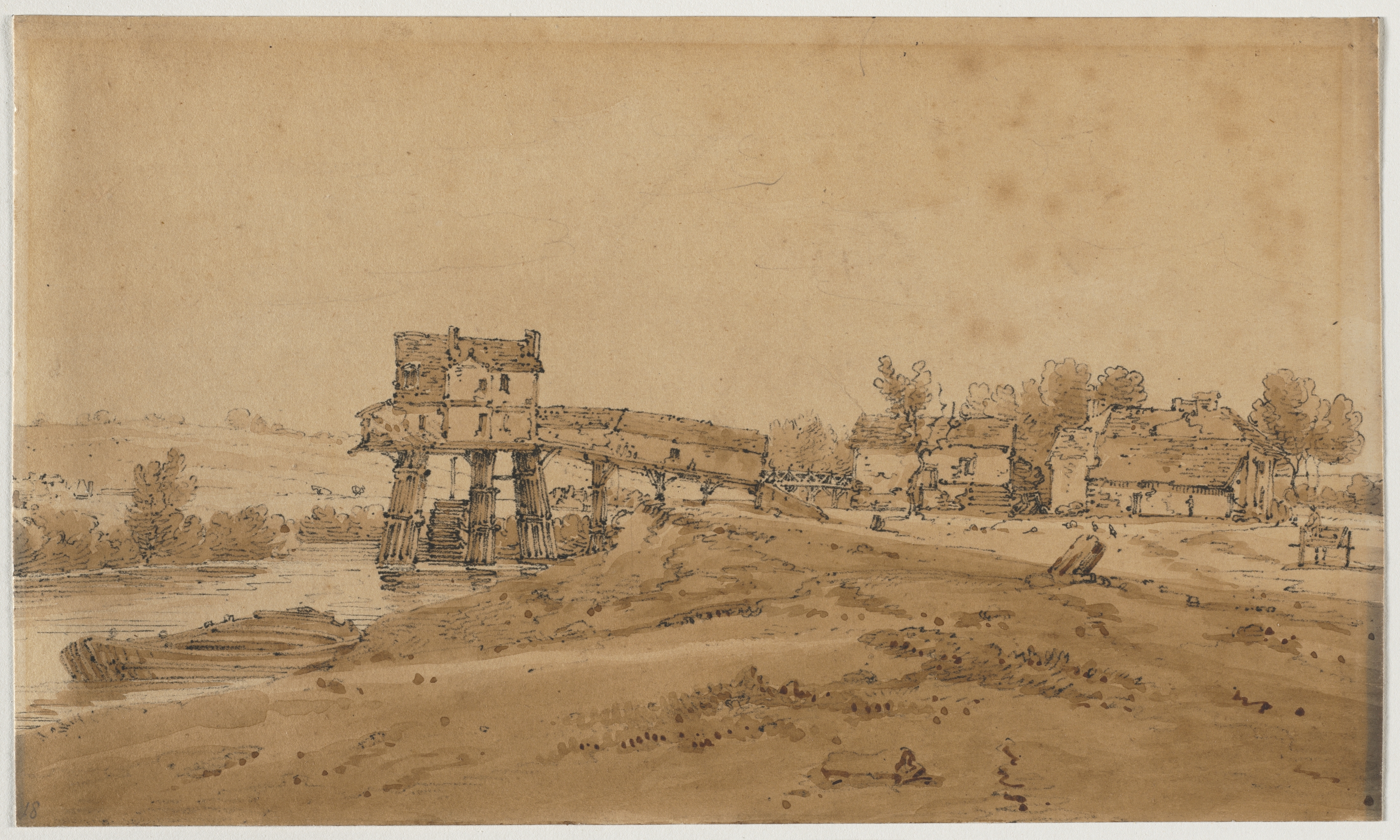 Brownish sepia-toned drawing on paper. A bridge with a tower on one end extends across a river on the left. The bridge has a flat top with columns supporting it over the water. A dirt hill slopes down to the river on the right. Trees line the river on the left and right sides. Small buildings along the right side. A person sitting on the ground in the foreground on right. A boat on the river to the left.