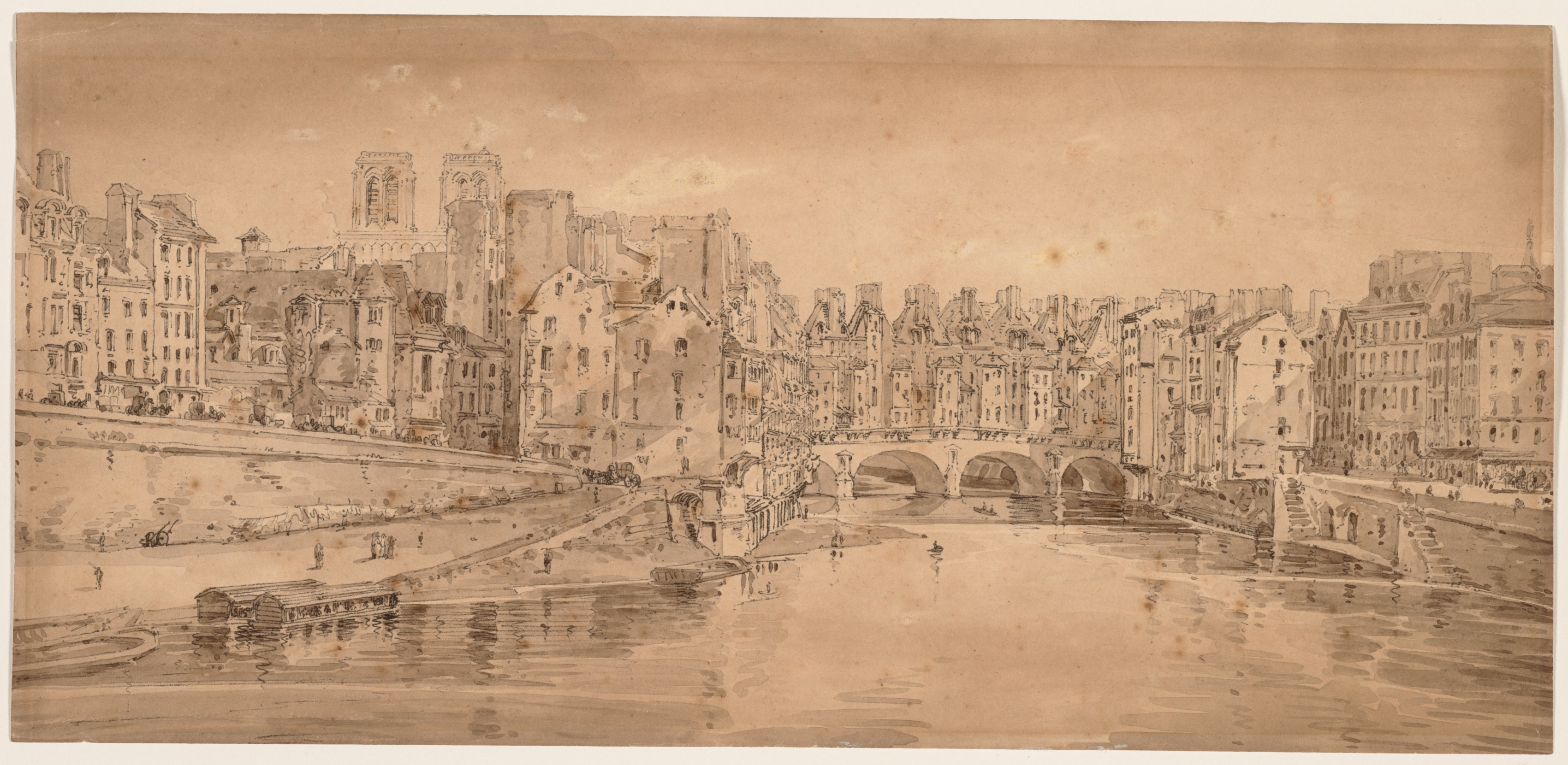 The image depicts a sepia-toned drawing of a cityscape. A river runs through the center of the image. On the far side of the river, a bridge with three visible arches spans the water. Buildings line both sides of the river, with a large church or cathedral on the left side, featuring two tall towers. People and a horse-drawn carriage are on the riverbanks. The sky is light with small clouds.