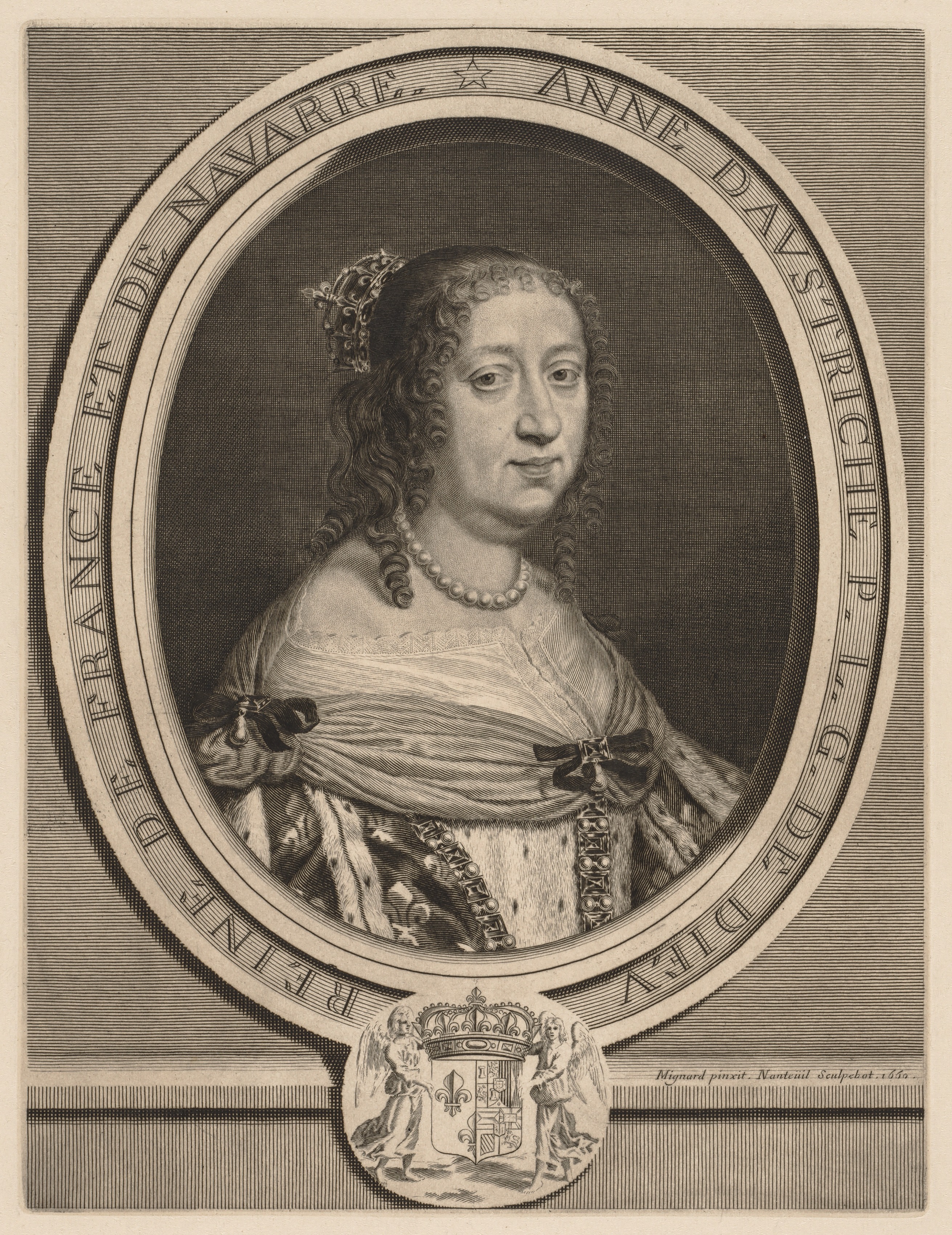 Black and white portrait of a woman in an oval frame. The woman has curly brown hair, a pearl necklace, and a dress with a bow at the chest. Her hair is pulled back and adorned with a decorative piece on the left side. The frame has text along the top and left side reading "Anne d'Autriche, Reyne de France et de Nauarre". At the bottom of the frame is a shield with a crown on top and two figures on either side. The background of the portrait is dark brown, while the background of the image is light brown with lines. There is small text at the bottom right.
