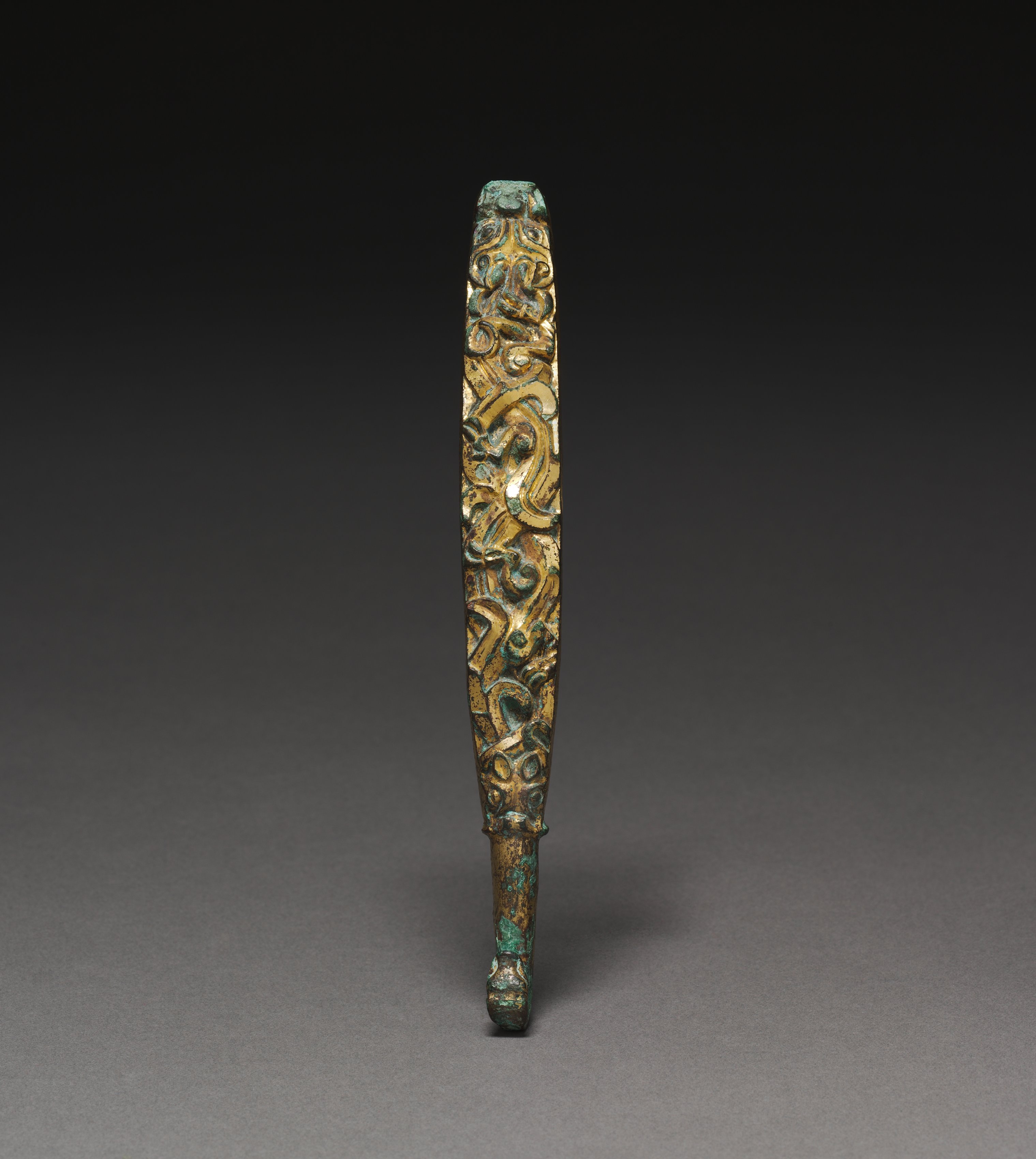 Belt Hook, Warring States period. The object is long and narrow with a rounded end. It has a curved shape. The surface is gold and bronze in color with a green patina. The surface is decorated with raised curvy designs. The background is dark gray to black, with the object casting a shadow.