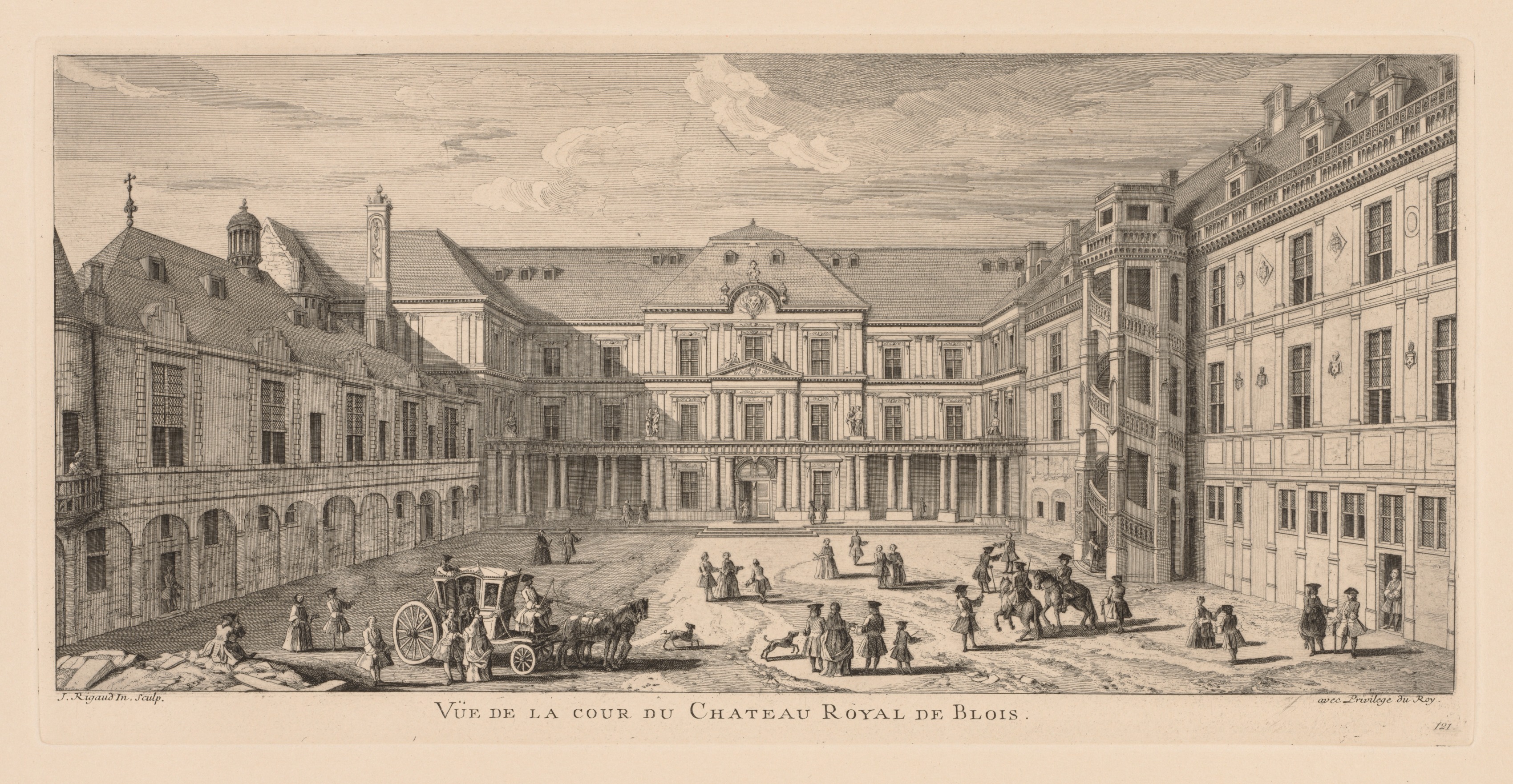 Black and white drawing of a courtyard. The courtyard is surrounded by three large buildings with many windows. The building in the background has a triangular pediment roof and columns at the front. The building on the left has a sloping roof and arches on the ground floor. The building on the right is similar in style to the one in the background. People in 18th-century clothing are walking around the courtyard. A horse-drawn carriage and horses are in the foreground. The sky is cloudy. The image is titled "Vue de la cour du Chateau Royal de Blois" and the artist is Jacques Rigaud.