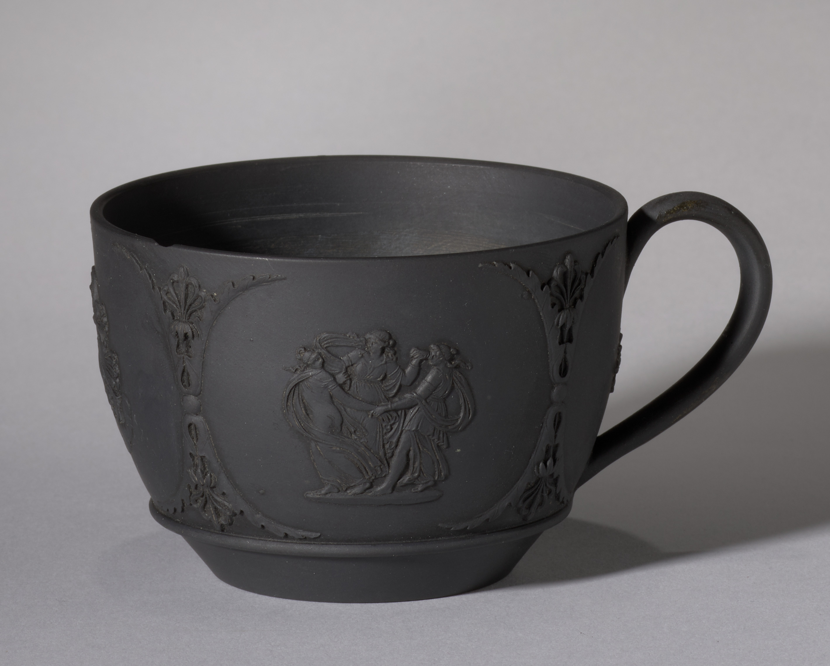 The Wedgwood Factory cup is a black ceramic cup with a rounded body and a handle on the right side. The cup's body features a wide mouth and a narrow base. A raised panel on the front displays a relief design of two figures. The cup's exterior is adorned with raised, ornate designs on either side of the panel. The background of the image is gray.
