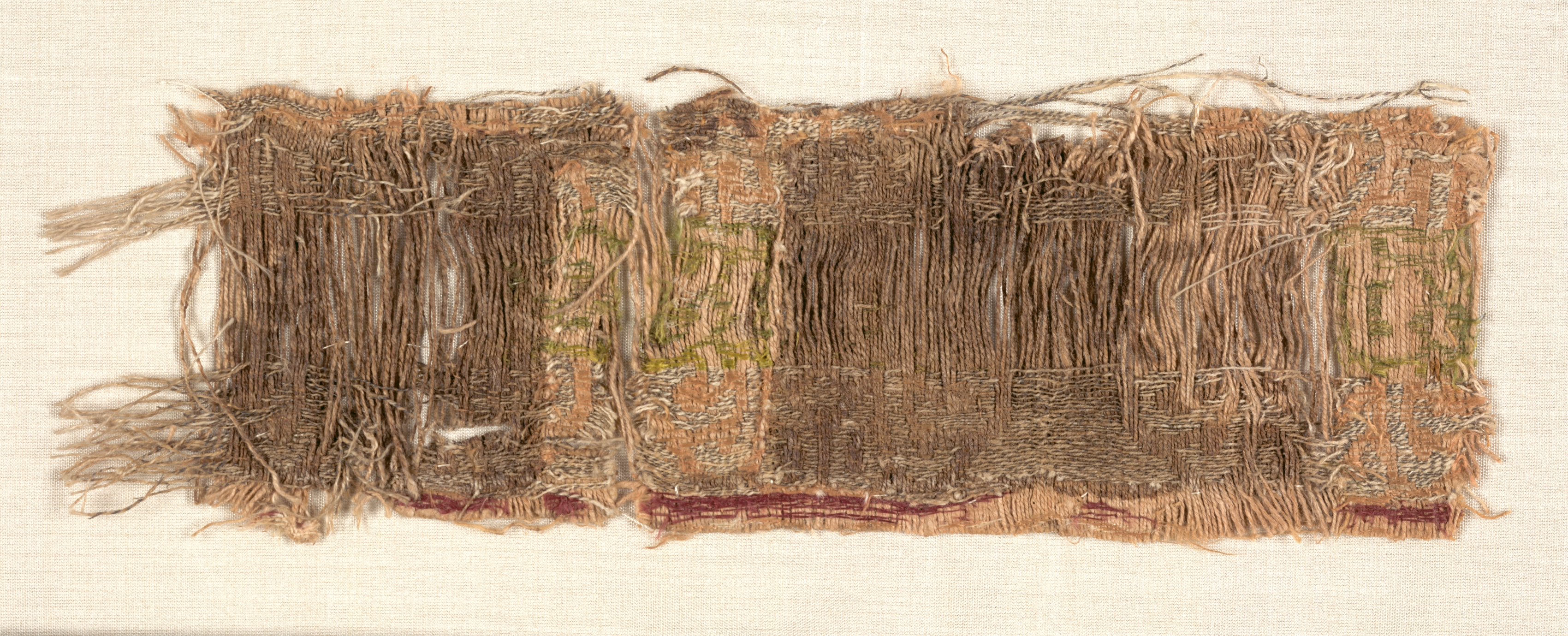 The textile fragment, by artist Faith Ringgold, is a rectangular piece with frayed edges and a predominantly brown color scheme. The fabric appears to be woven with various shades of brown, tan, and beige threads, some of which are loose and hanging. There are also hints of green and red visible in certain areas. The background of the image is a cream-colored fabric that provides a neutral contrast to the textured, earthy tones of the textile fragment. The overall appearance suggests an aged or vintage textile.