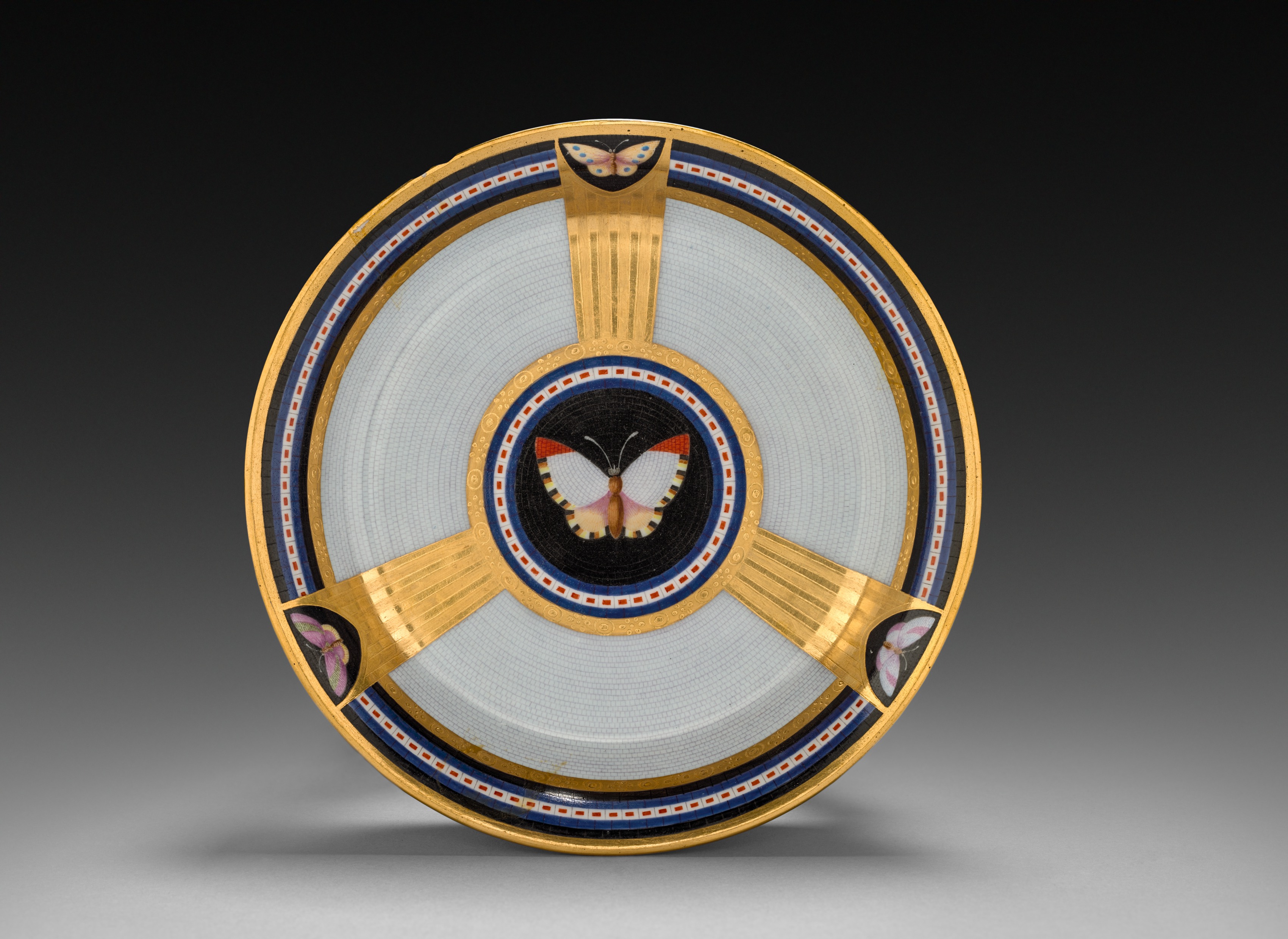 Round, flat plate with a wide rim. The plate has a white background. The rim is gold with a blue and orange dotted line on the inside and another blue and orange dotted line closer to the edge. There are three gold sections extending from the rim to the center. Each of the gold sections has a butterfly design at the end, near the rim. The butterflies are multicolored. In the center, there is a black circle with a blue and orange dotted line. Inside the black circle, there is a butterfly with white, black, orange, and gold details. The background of the image is black at the top and fades to gray at the bottom.