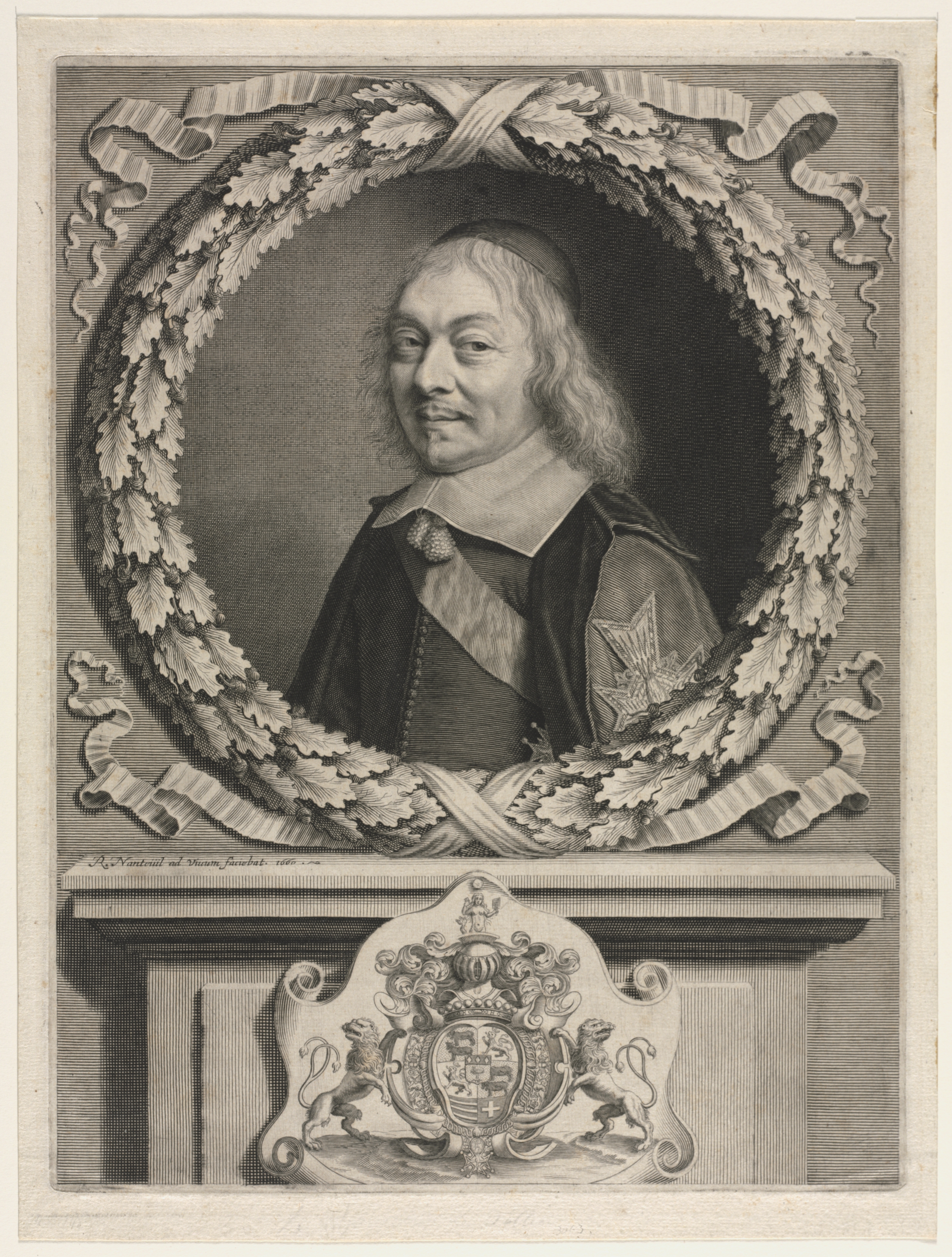 Black and white portrait of a man with long wavy hair wearing a dark colored robe with a star on the right shoulder and a white collar. The man is centered in a circular frame decorated with ribbons and oak leaves, the frame is surrounded by a beige border. The man looks to his left. Below the frame is a decorative shield with a crown on top and two lions on either side.