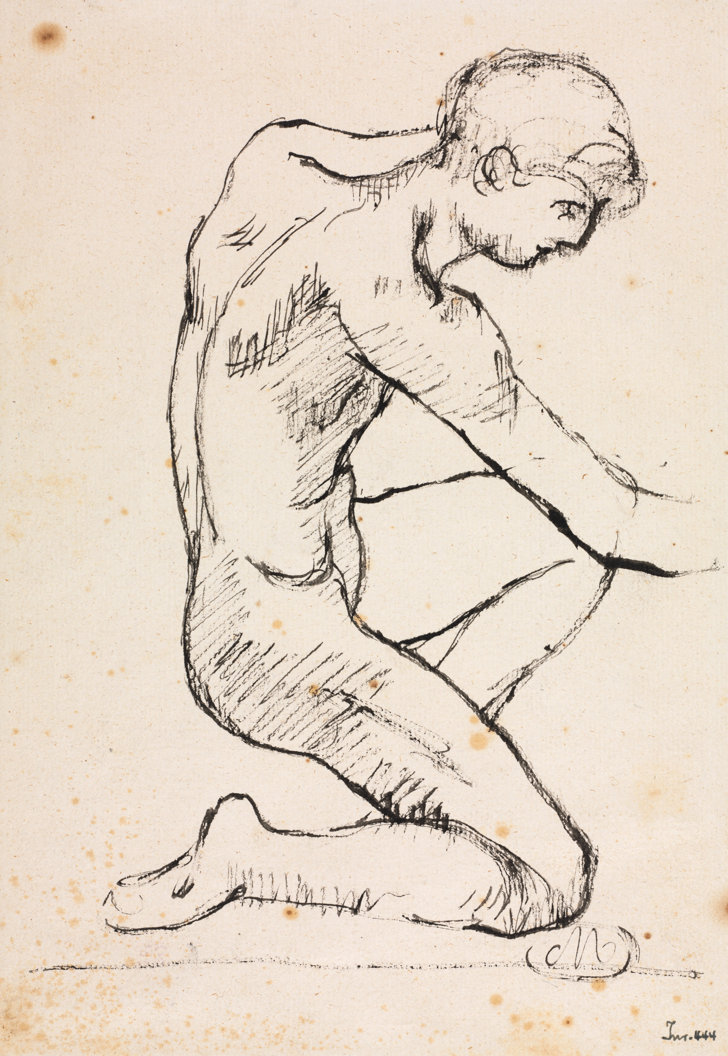Black sketch on beige background of a kneeling male nude with short hair; knees on ground and arms bent; turning to the right; some shading; darker spots around. Signed by Aristide Maillol.