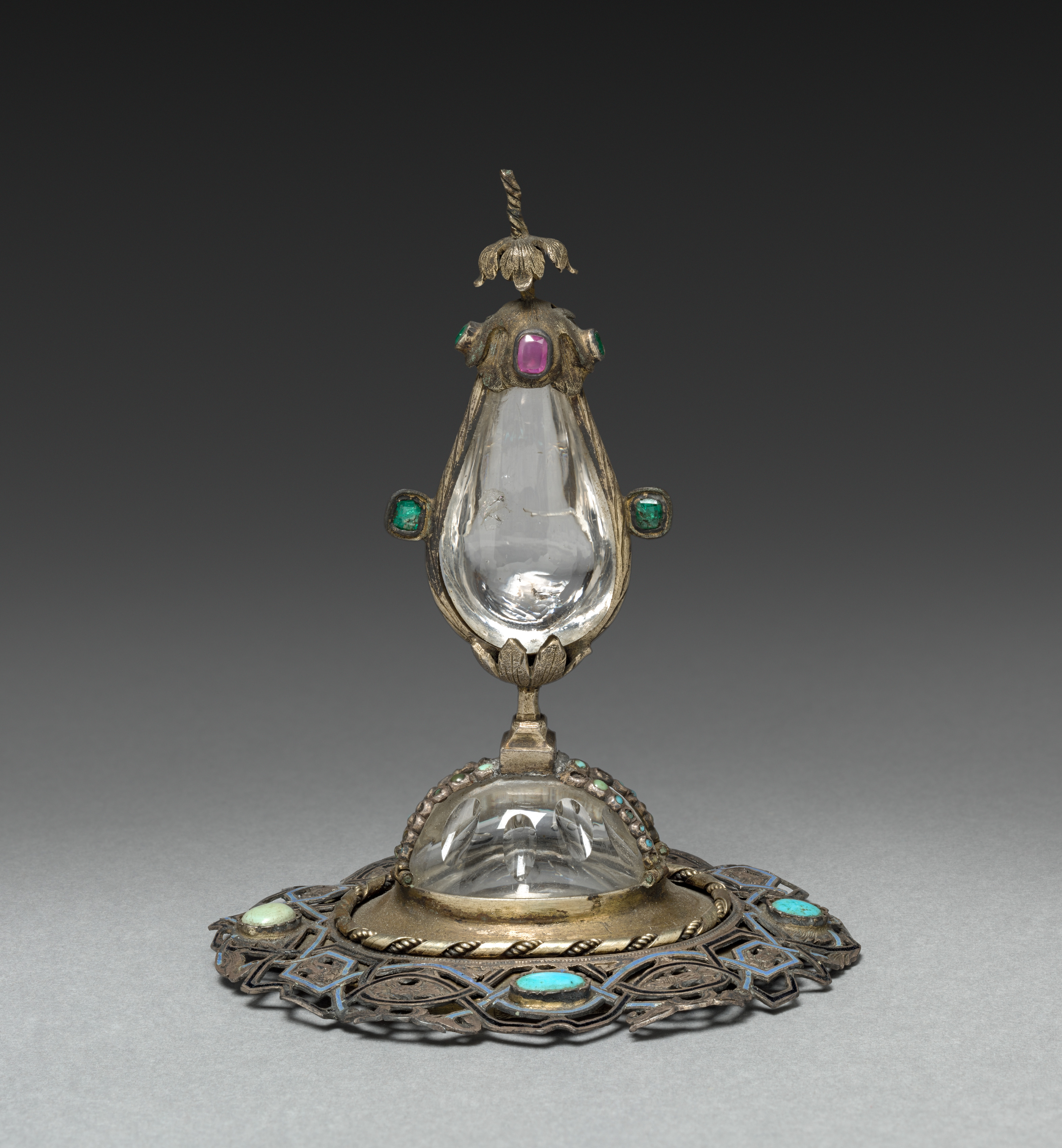 The object titled "Blood Reliquary (lid)" by an unknown artist depicts a glass reliquary. The glass component has a teardrop shape with a clear, transparent body and a rounded base. The base is supported by a gold-colored metal stem with a decorative finial on top. The glass component is encased in a gold-colored metal frame with a pink gemstone at the top and two green gemstones on either side. The frame sits atop a circular base with an intricate design featuring turquoise stones. The base has a wavy edge with a repeating pattern of curved lines and shapes. The background of the image is a gradient of dark gray to light gray.