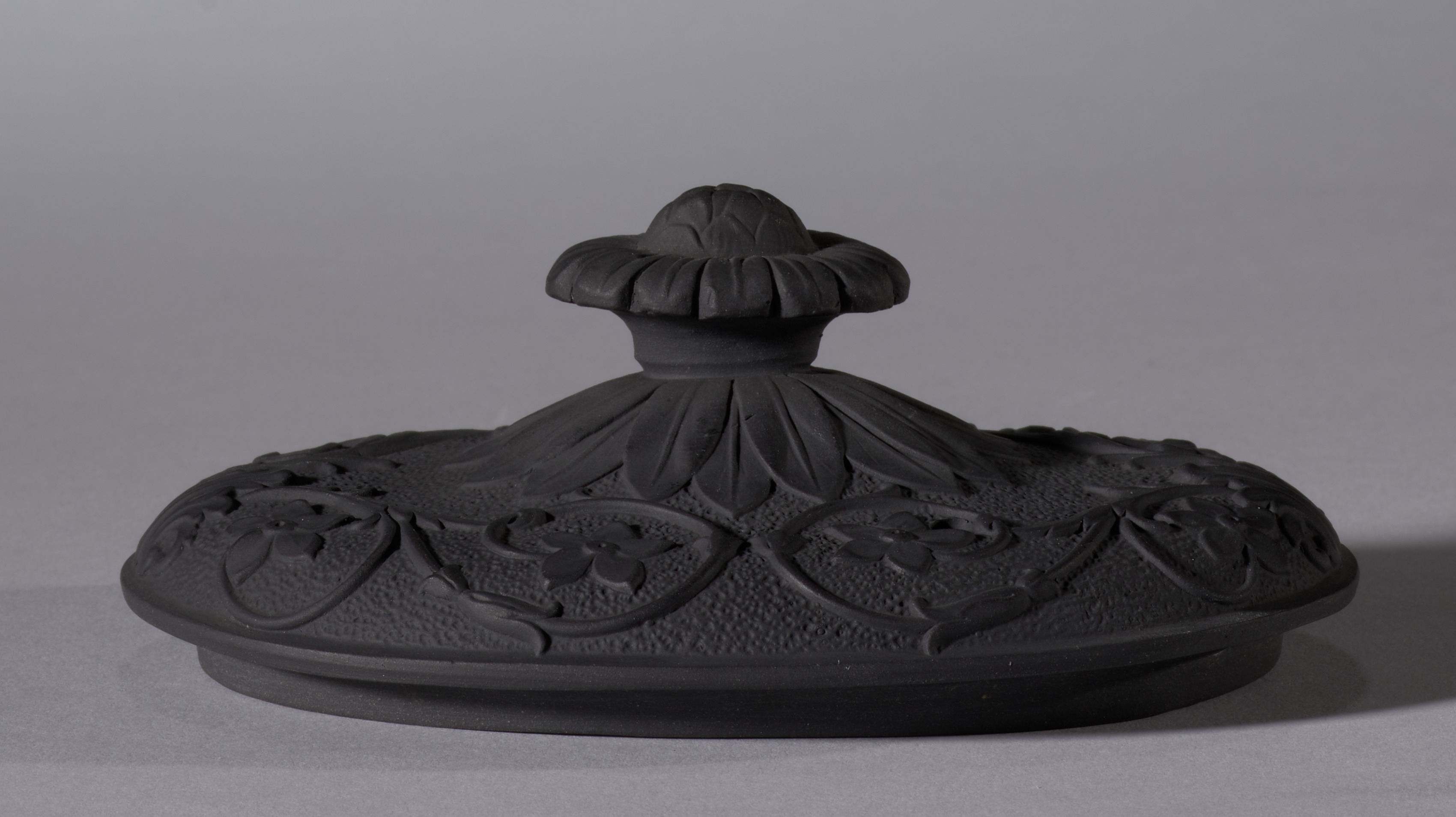 The image shows a black teapot cover, made from a dark material, possibly ceramic or metal. The cover is round with a short stem and knob on top. The knob on top is mushroom-shaped with petal-like ridges around the edges. The top of the cover has petal-like shapes radiating out from the knob. The edge of the cover features an embossed design resembling flowers or leaves. The cover sits on a flat surface against a plain gray background. The image is a product photo with controlled lighting. The cover is titled "Teapot (cover)" by artist Elijah Mayer.