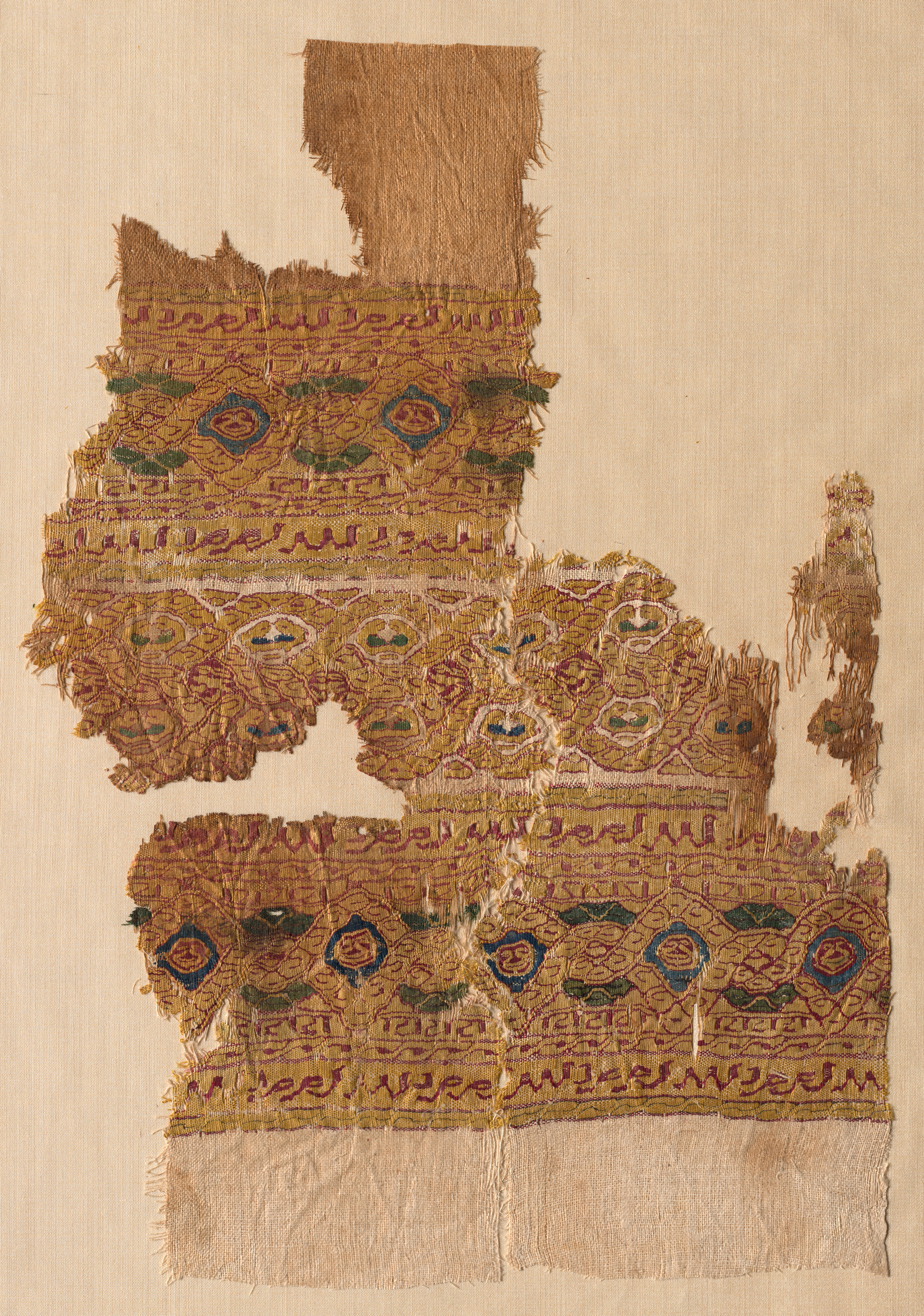 Fragment of a Tiraz-Style Textile by unknown artist. The image shows a piece of torn and frayed fabric with intricate patterns and designs. The fabric is primarily golden-brown with a light beige background that the fabric is mounted on. There are horizontal bands of repeating patterns across the fabric, featuring blue and green diamond shapes surrounded by golden details. The fabric appears to have Arabic calligraphy woven into the bands. The fabric is torn into irregular shapes, with rough edges and some areas of significant fraying. The fabric is mounted on a light-colored material, possibly paper or cardboard, which provides a neutral background for the textile. The overall appearance suggests that the fabric is an antique or vintage piece, possibly from the Middle East or North Africa. The fabric's intricate patterns and calligraphy are characteristic of Tiraz-style textiles.