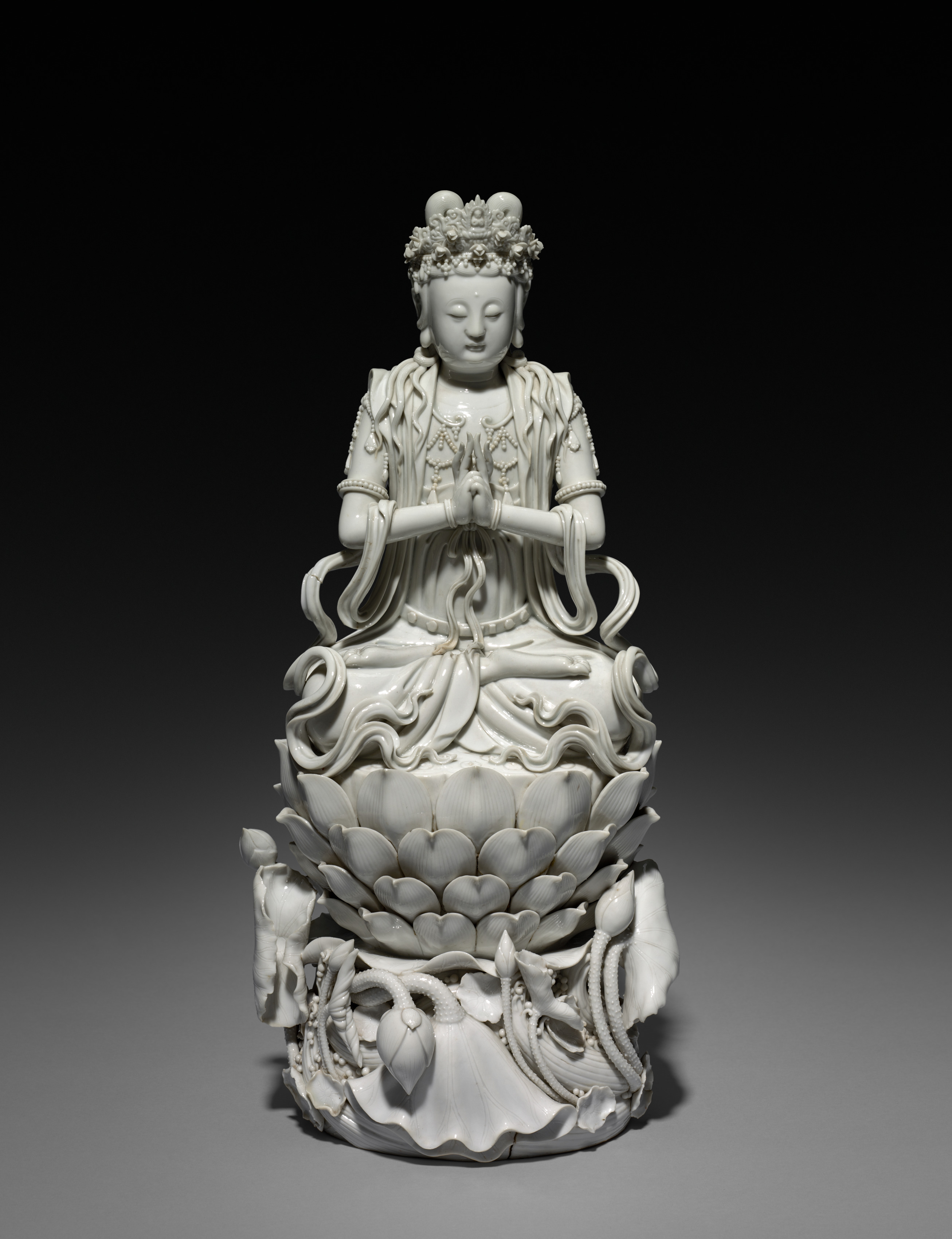 The Bodhisattva Guanyin of the South Sea is a white statue of a woman sitting on a lotus flower. The woman has her eyes closed and her hands clasped in front of her. She wears a crown on her head, and her hair is styled in an updo. She has a serene expression on her face. She wears a long robe with intricate designs and patterns. The robe drapes over her shoulders and around her body. The lotus flower she sits on has large petals that curve outward. The base of the statue features more lotus flowers and foliage. The background of the image is black, with a gradient that fades to gray at the bottom.