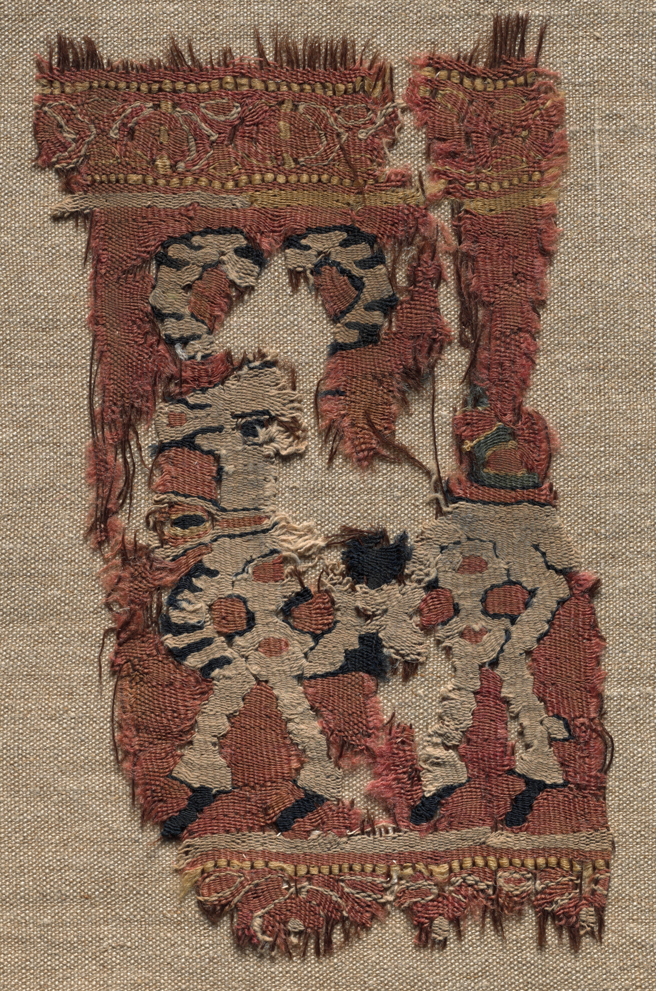 Fragment from a garment, rectangular with frayed top and bottom edges. Reddish-brown color with intricate pattern of cream, black, and red. Top section features horizontal band with curvilinear design in shades of red and gold. Below, two vertical sections with similar design, possibly attachment points. Main body of fragment has abstract pattern with rounded shapes in cream, black, and red. Bottom section features another horizontal band with curvilinear design. Fragment mounted on beige fabric background, possibly burlap or linen.