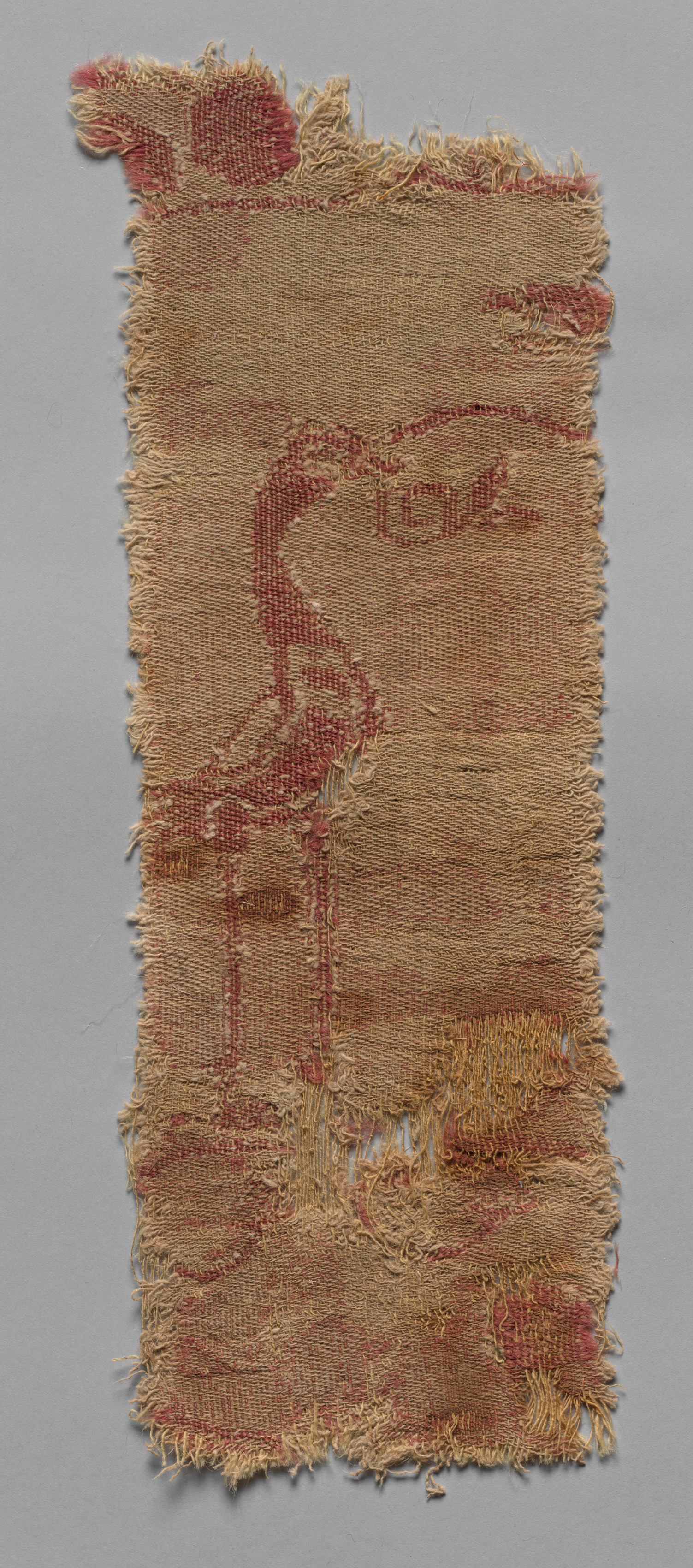 Fragment of Large Scale Roundel by artist unknown. The image shows a piece of frayed fabric with a red design on it. The fabric is light brown and rectangular, with frayed edges. The top and bottom edges are more frayed than the sides. There is a red design in the center of the fabric that appears to be a stylized animal or figure with a long neck. The background of the image is gray.