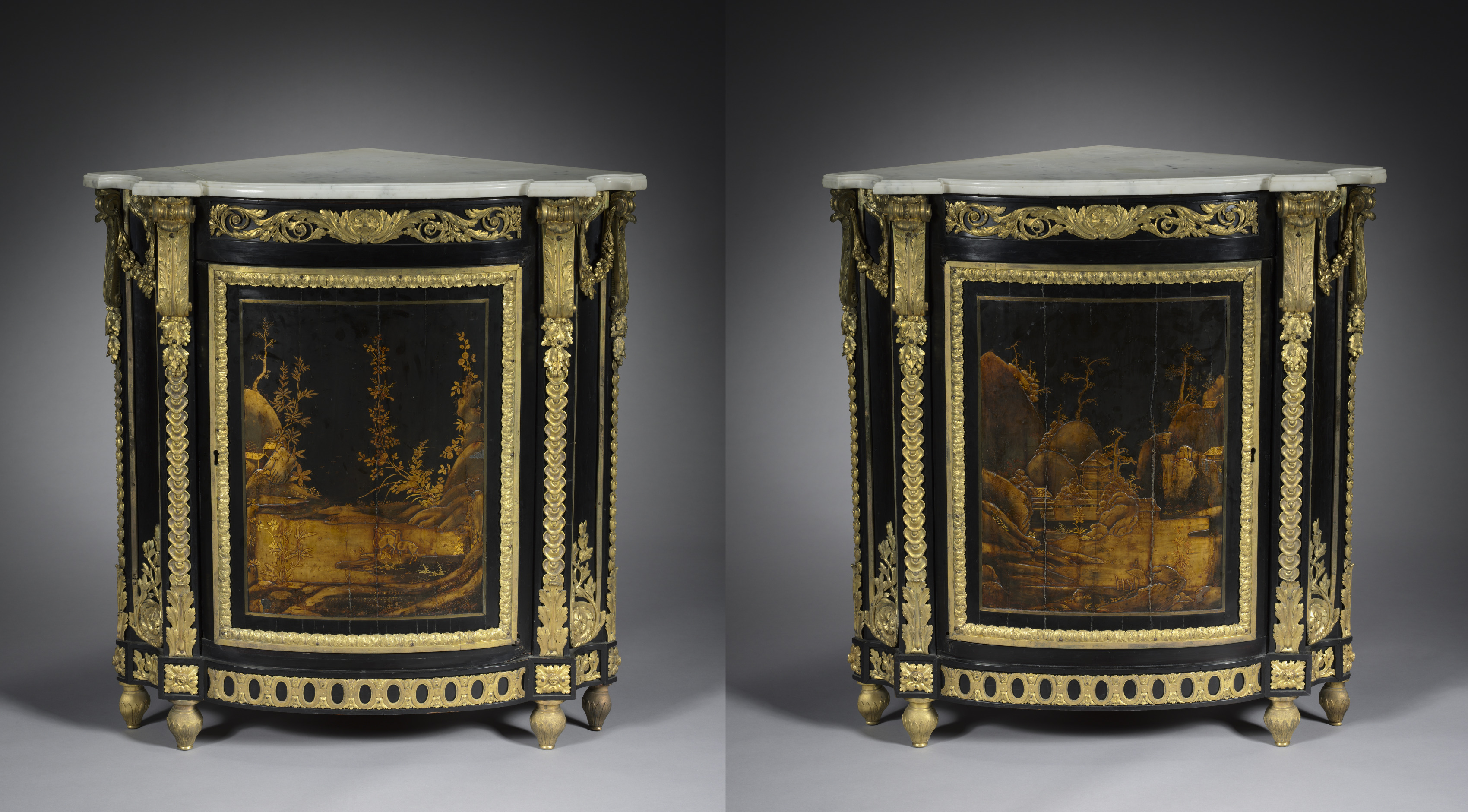 Two identical corner cabinets, titled 'Pair of Corner Cabinets' by René Dubois. The cabinets are black with gold accents and have a white marble top. The gold accents are ornate and include carved designs on the sides, top, and bottom. The cabinets have a painting or inlay on the front, depicting a landscape scene with trees, rocks, and a body of water on the left cabinet and a rocky landscape on the right cabinet. The cabinets are shown from the front, with a slight angle to show the curved sides. The background of the image is dark gray, with a lighter gray floor. The cabinets have four small gold feet. The gold accents include columns on the sides and a decorative border around the top and bottom. The marble tops are smooth and white. The landscape scenes on the cabinets are surrounded by a gold border. The overall design of the cabinets is ornate and luxurious.
