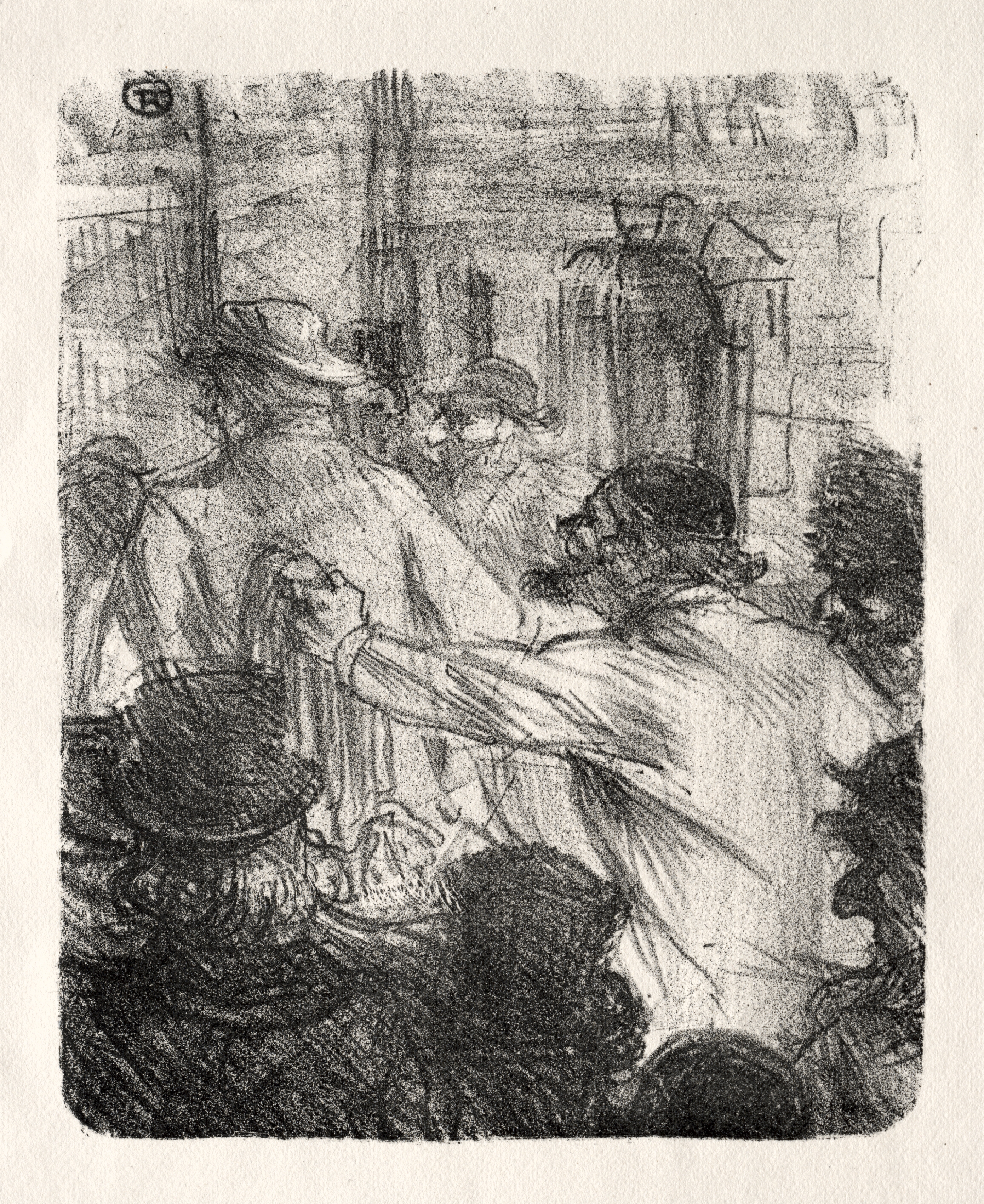Black and white drawing of a scene depicting people in a room. A man extends his arm to another individual. The man wears a white shirt with long sleeves. He has dark hair and faces towards the left. He appears to be handing an object to another man. This second man, on the left, wears a white shirt and a flat cap. The background includes stone walls and an arched doorway. Other individuals are present around the room.