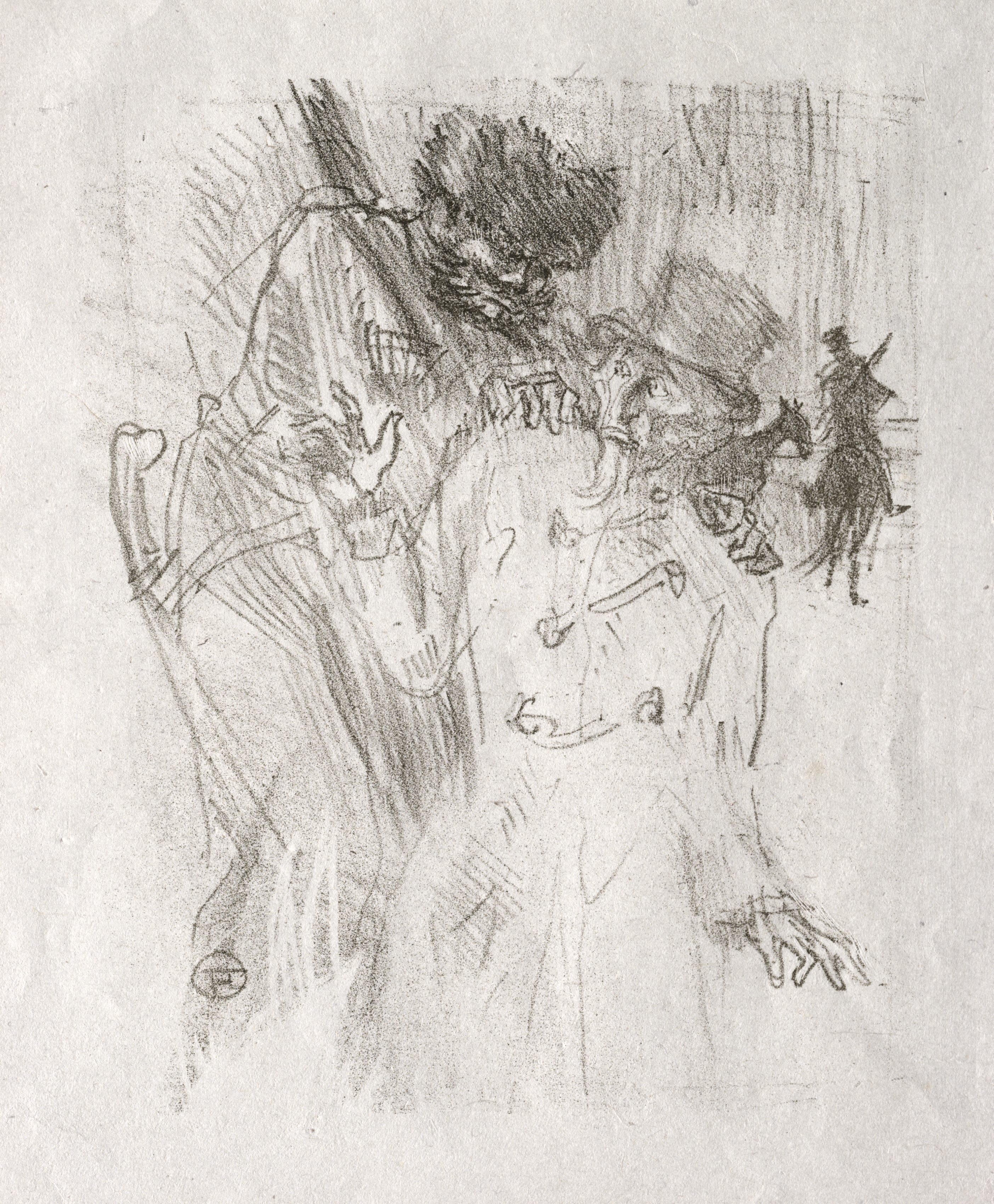 Black and white sketch on light gray paper. A man with a large build and a hat is being grabbed from behind by another man. The man being grabbed has a large hat and a mustache and beard. He wears a buttoned up jacket with his right arm outstretched. The man grabbing him wears a hat and a long coat. There is a third man on horseback in the background on the right.