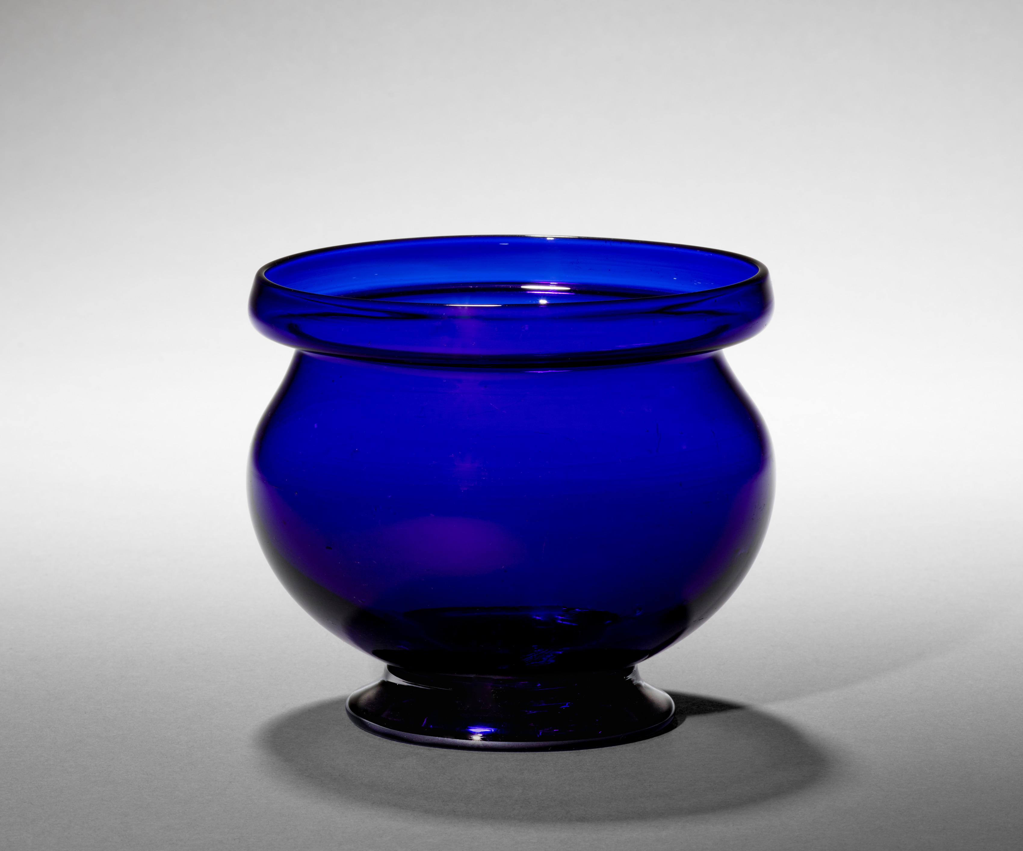 Sapphire Blue Sugar Bowl by artist. Deep blue colored glass bowl with a wide mouth and narrow base. The bowl is translucent and has a glossy finish. It has a rounded body that curves inward at the top to form the mouth. The base of the bowl is short and circular. The background is light gray with a shadow cast by the bowl.
