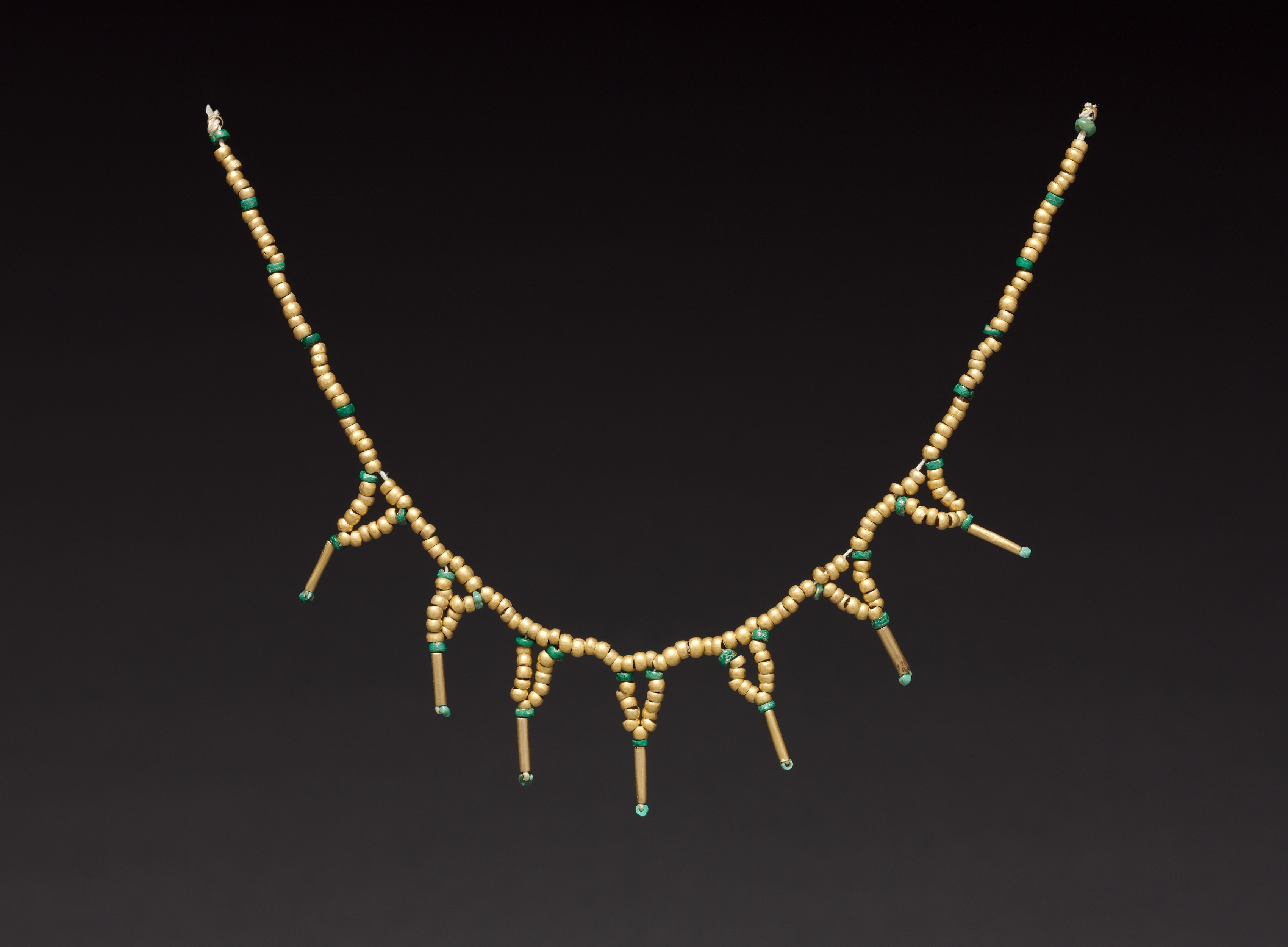Gold necklace with small round beads and green spacers. Necklace has five drop shaped elements with multiple small round beads at top and single long thin cylindrical beads at bottom. Drops are arranged in a row across bottom of necklace. Beads are gold colored. Background is black.