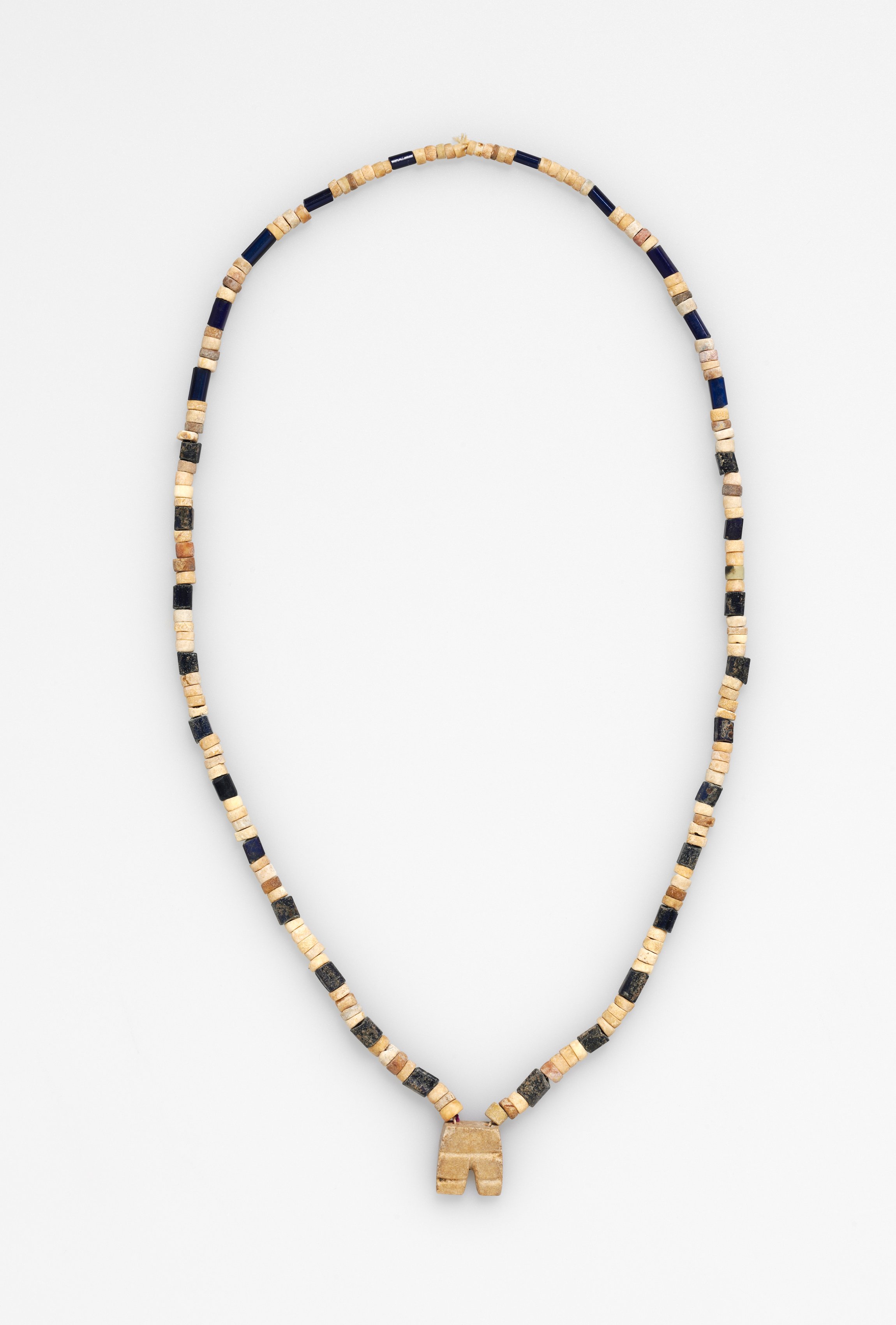 Necklace by Alexander Moroze. A necklace made of small square and rectangular beads. The beads are in black and various light brown shades. The necklace forms a rough oval with one large light brown, cross shaped pendant at the bottom.