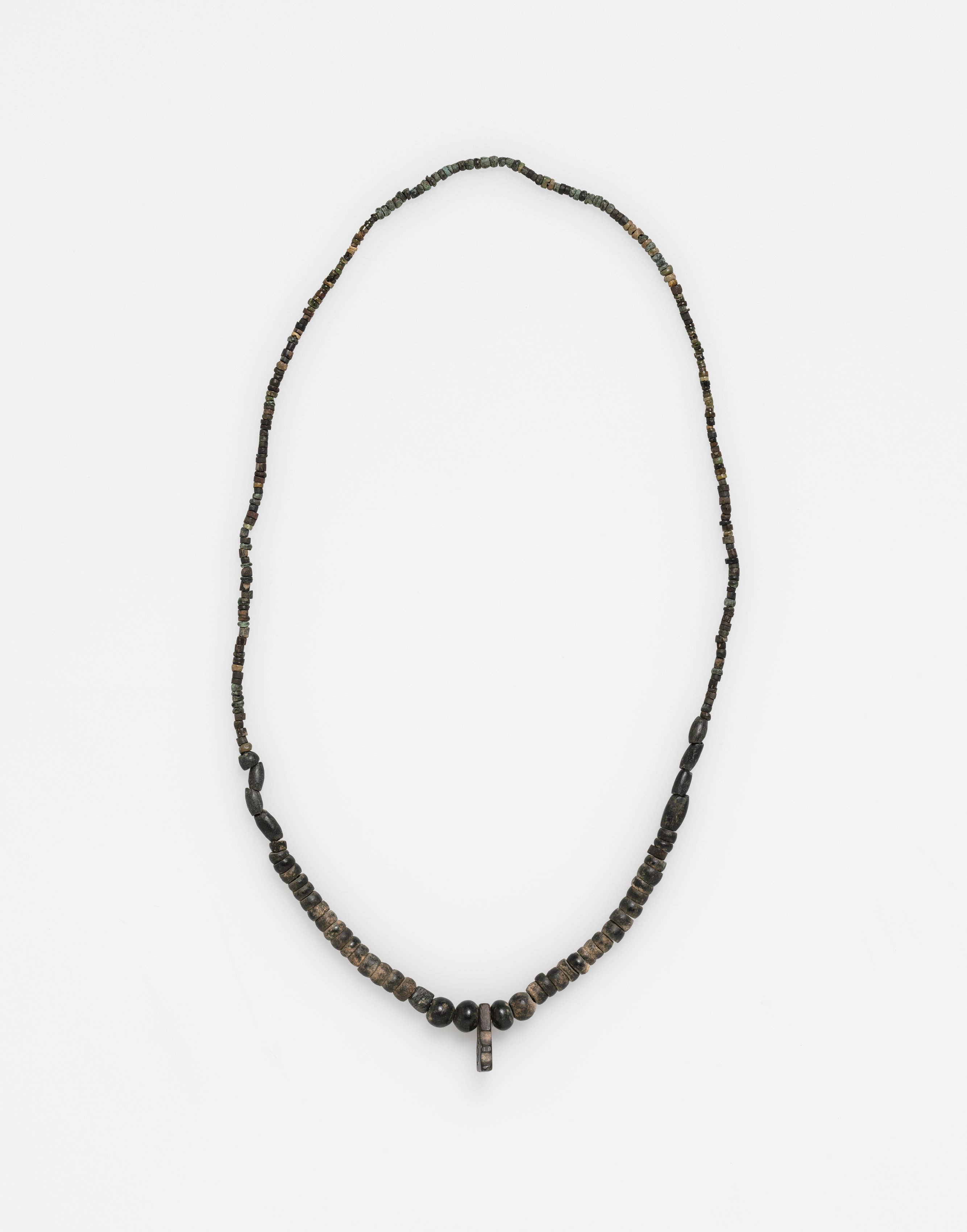The necklace is made of small dark-colored beads. The beads are predominantly shades of black, brown, and gray. The necklace appears to be made of tiny, faceted, and rounded beads that are uniformly small. There are larger beads grouped together at the front center, and a small rectangular metal piece hangs from the center. The background of the image is white. The artist and title of the piece is "Necklace".