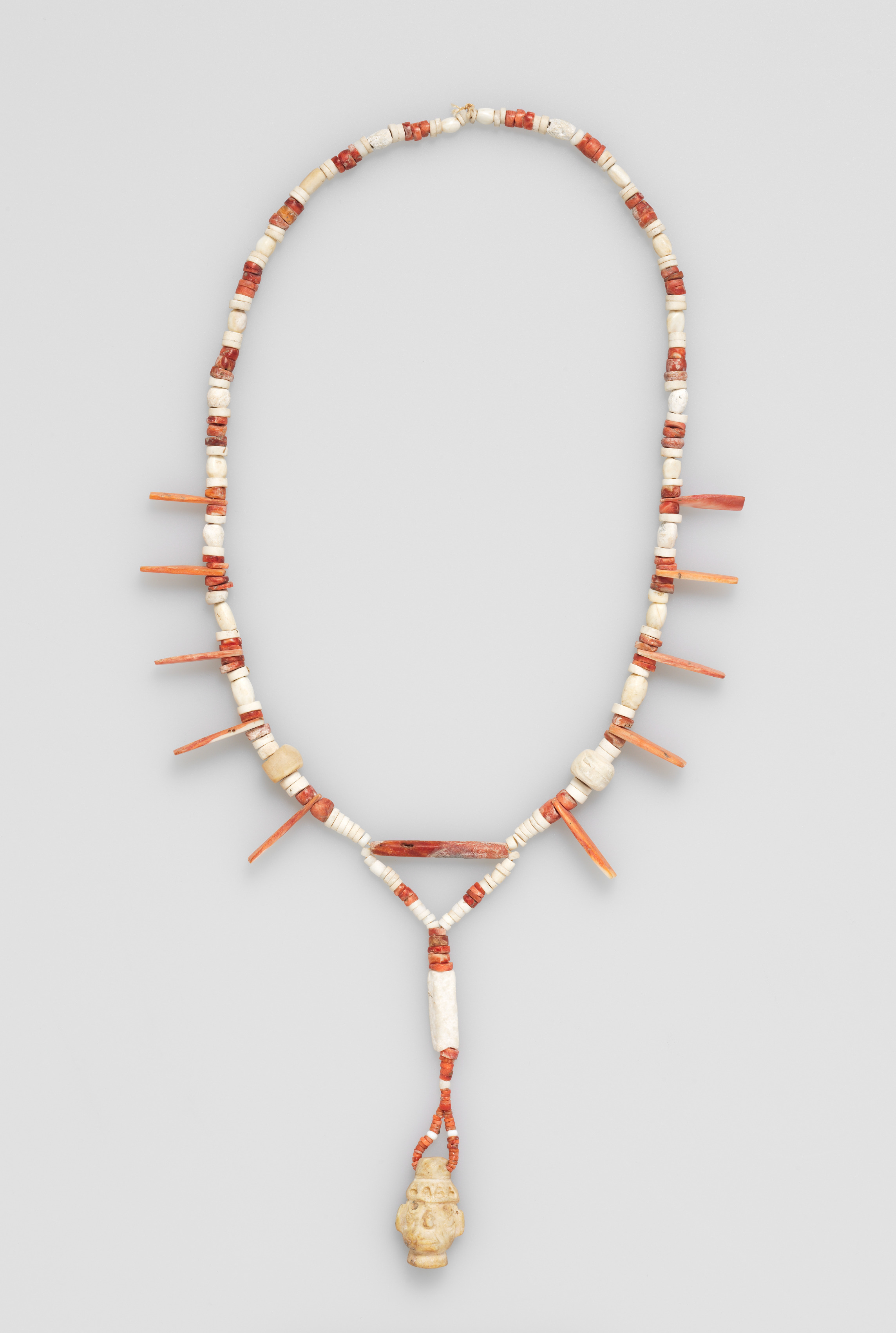 Necklace by Ananda K. Coomaraswamy, made of white and red beads and orange sticks with a white pendant. The necklace is oval-shaped and lies flat. The beads are small and cylindrical, alternating between white and red. There are 12 orange sticks protruding from the necklace, 6 on each side. The pendant is white, carved with a face, and hangs from the bottom of the necklace. The background is gray.