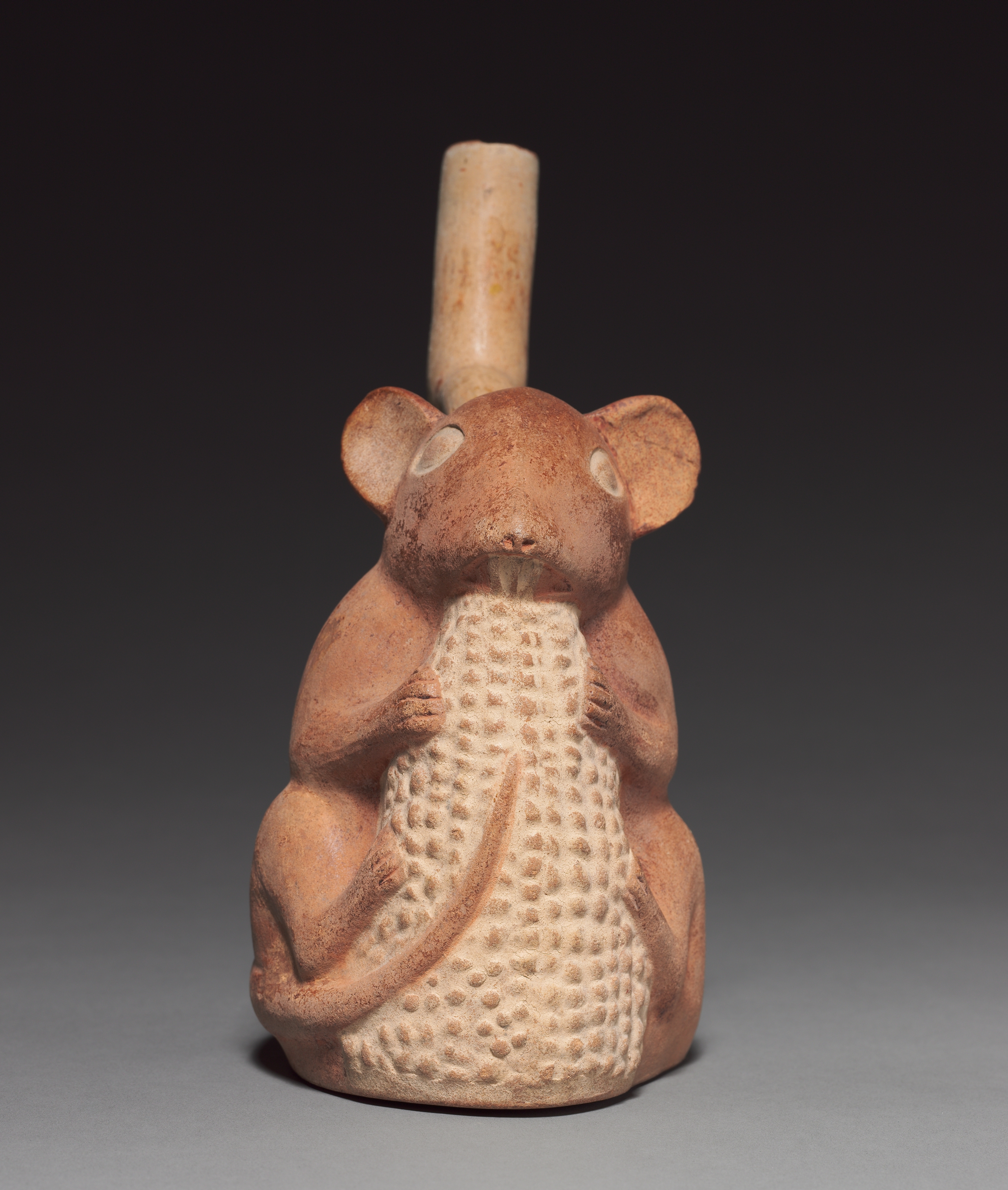 Terracotta sculpture of a rodent holding corn on the cob titled "Rodent with Corn" by artist Francisco Narváez. The rodent has a brown body and ears, two small circular eyes, and a protruding cylindrical object on top of its head. The corn on the cob is beige with textured kernels. The rodent sits upright with its hands on either side of the corn. The background is dark gray to black, with the sculpture sitting on a light gray surface.