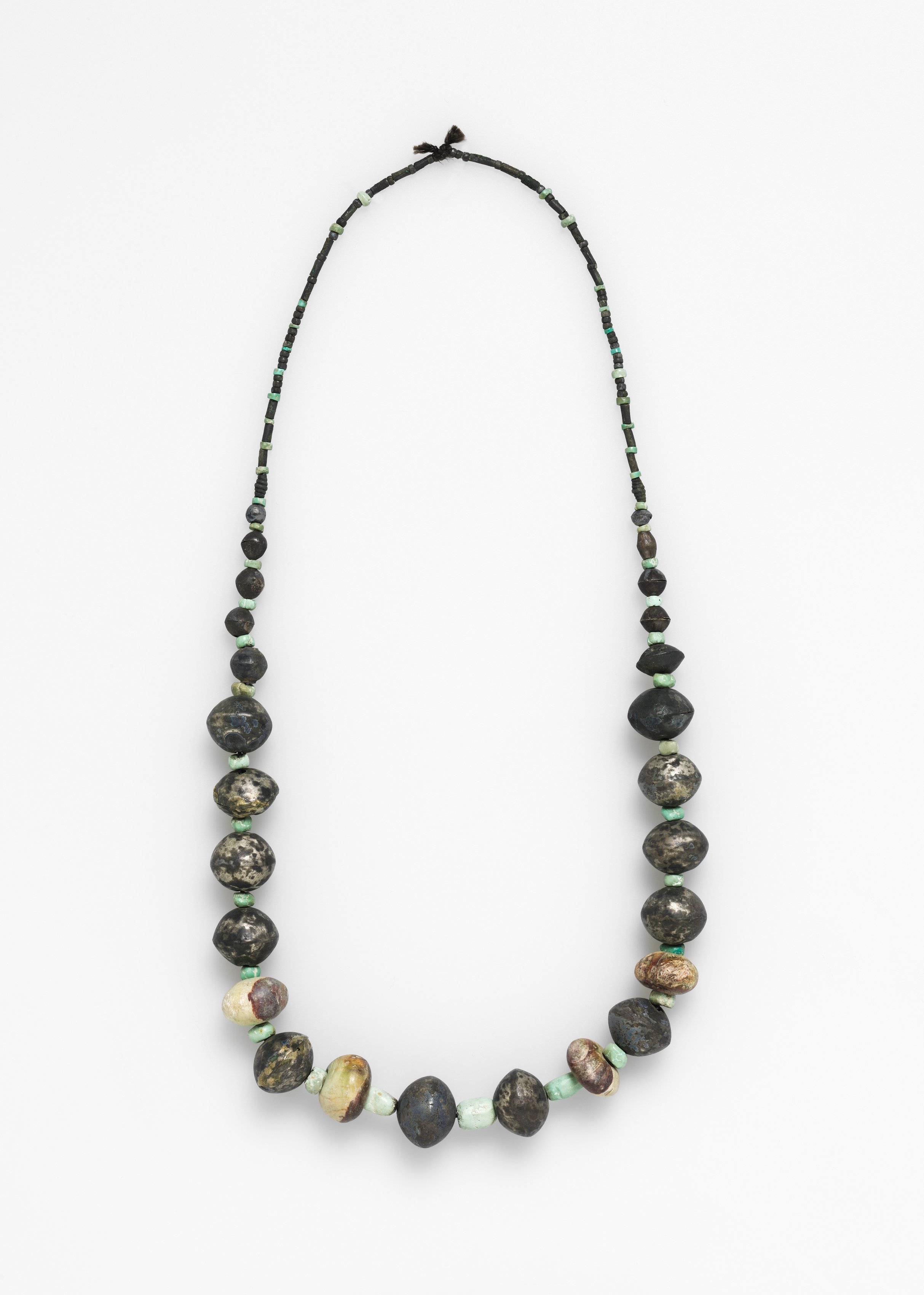 The necklace, created by artist Necklace, features a thin cord made of small, dark green and light green beads. The cord has a bow-tie knot at the top. The necklace comprises large, irregularly shaped beads in various sizes and dark colors with light patches. The beads are separated by small light green beads. The background of the image is white.