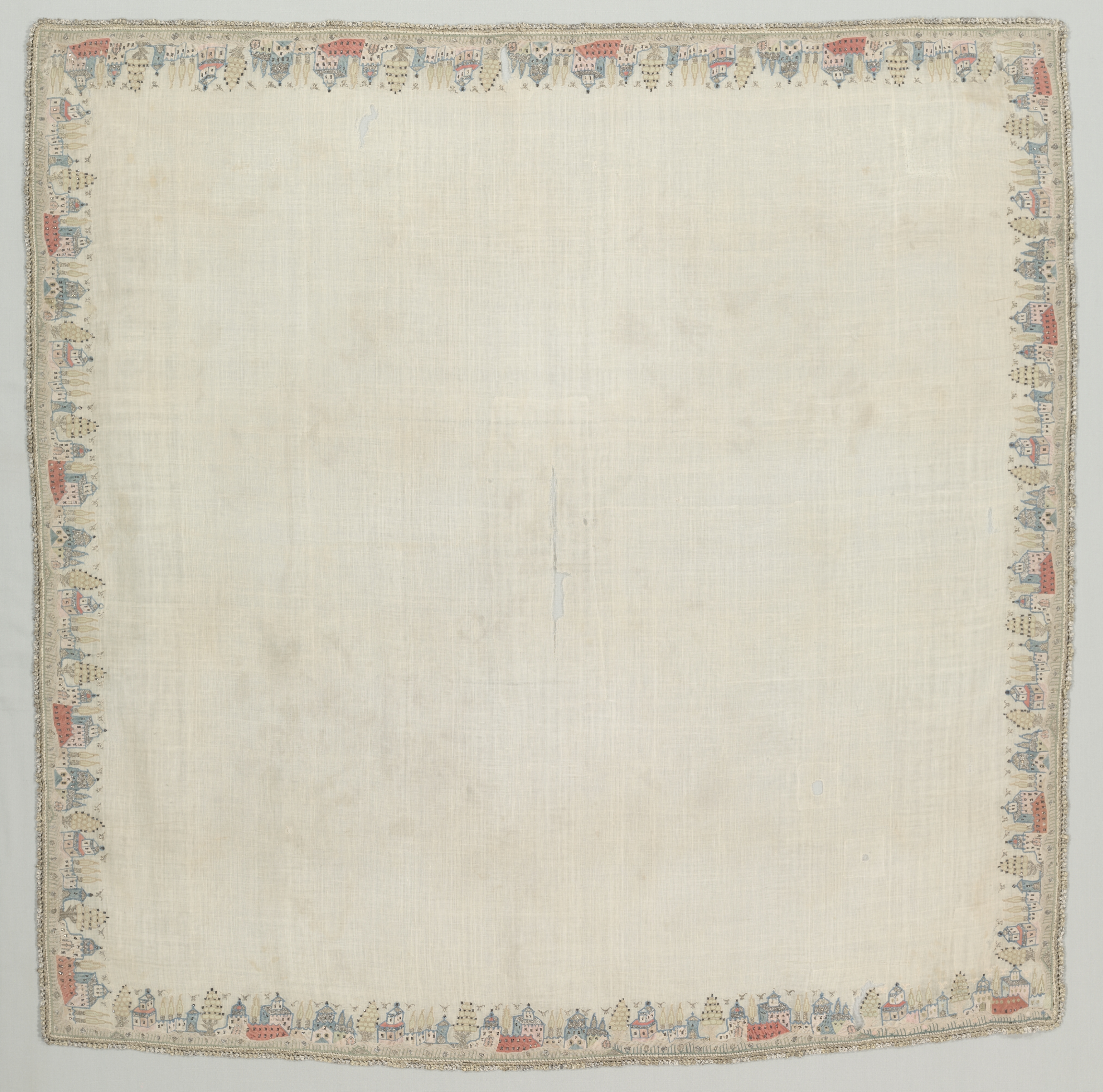 The image, titled "Table Cloth" by an unknown artist, shows a square tablecloth with a cream-colored background. The tablecloth has a border around the edges, featuring a repeating pattern of small houses in blue, red, and beige. The houses are depicted in a simple style, with minimal details. The border is frayed and worn, giving it a vintage appearance. The tablecloth itself appears to be made of a lightweight material, possibly linen or cotton, and has a subtle texture visible in the image. There are some faint stains and discolorations on the surface of the tablecloth, adding to its aged look. The background behind the tablecloth is a plain gray color.