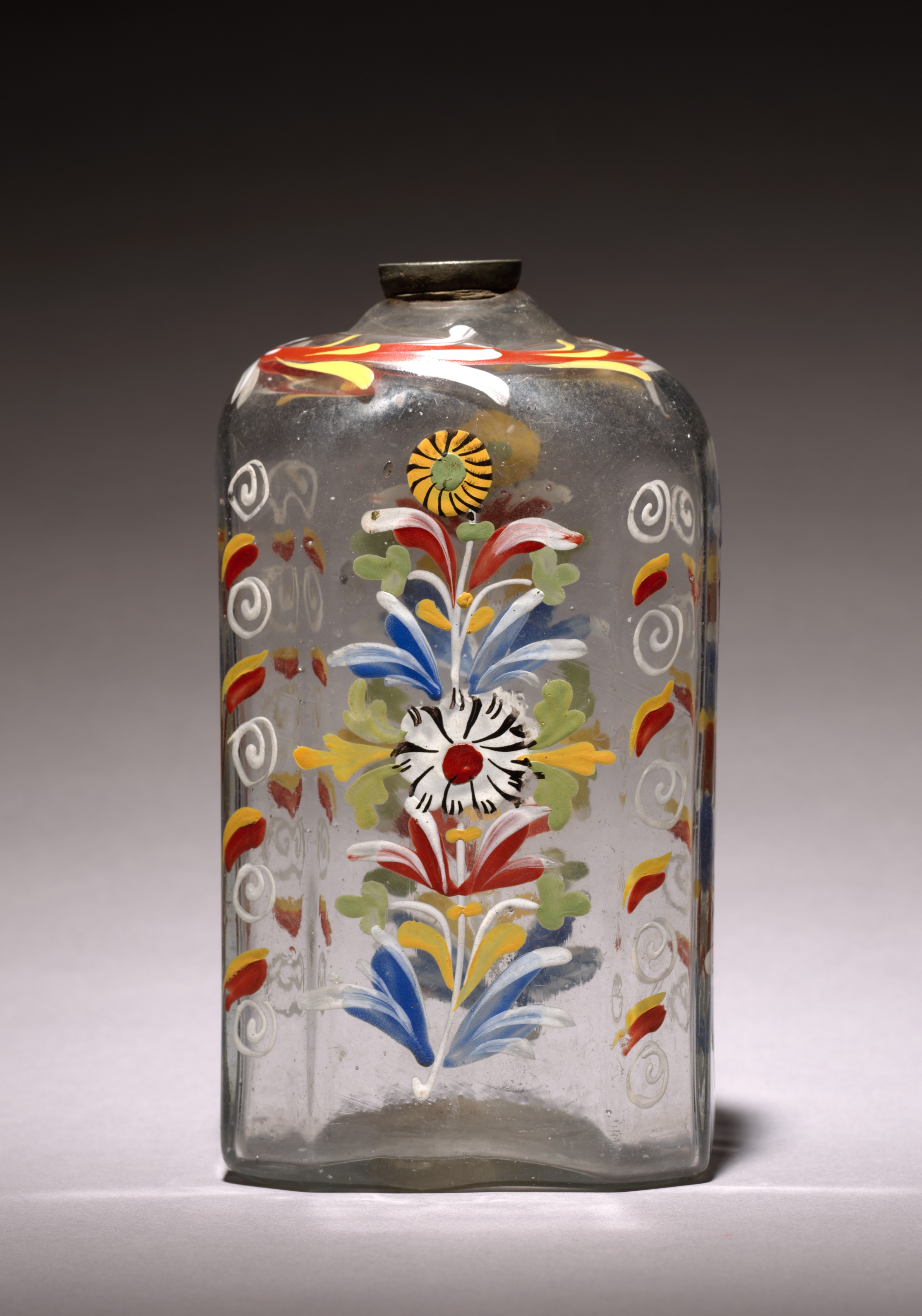 Clear glass bottle with a rounded rectangular shape and a small circular opening at the top. The bottle features a colorful floral design in the center, consisting of a white flower with a red center and black lines, surrounded by blue, red, yellow, and green petals. The design is flanked by white swirls on either side. A border of red, yellow, and white shapes, possibly flames or leaves, is visible at the top and down the sides. The background of the image is dark at the top and light at the bottom, with a shadow cast by the bottle.