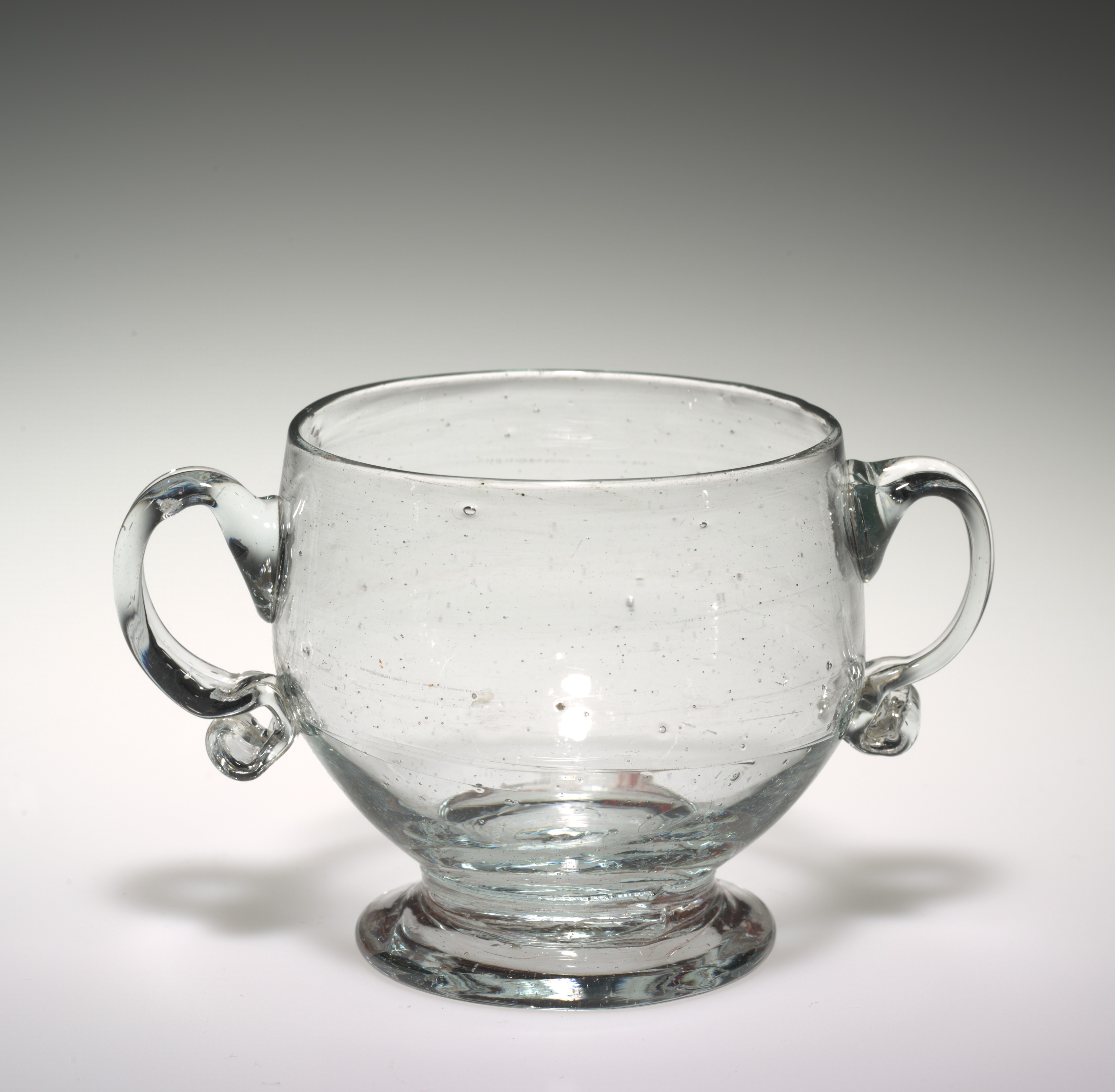 Clear glass bowl, "Sugar Bowl", artist unknown. The bowl has two handles on either side, each handle attached with a small blob of glass on either side of the bowl. The bowl is clear with small bubbles visible within the glass. The bowl has a wide mouth and a narrow base. The background is white with a shadow cast by the bowl. The image shows the bowl from the front. The handles are on either side and curve outward. The bowl sits on a flat surface.