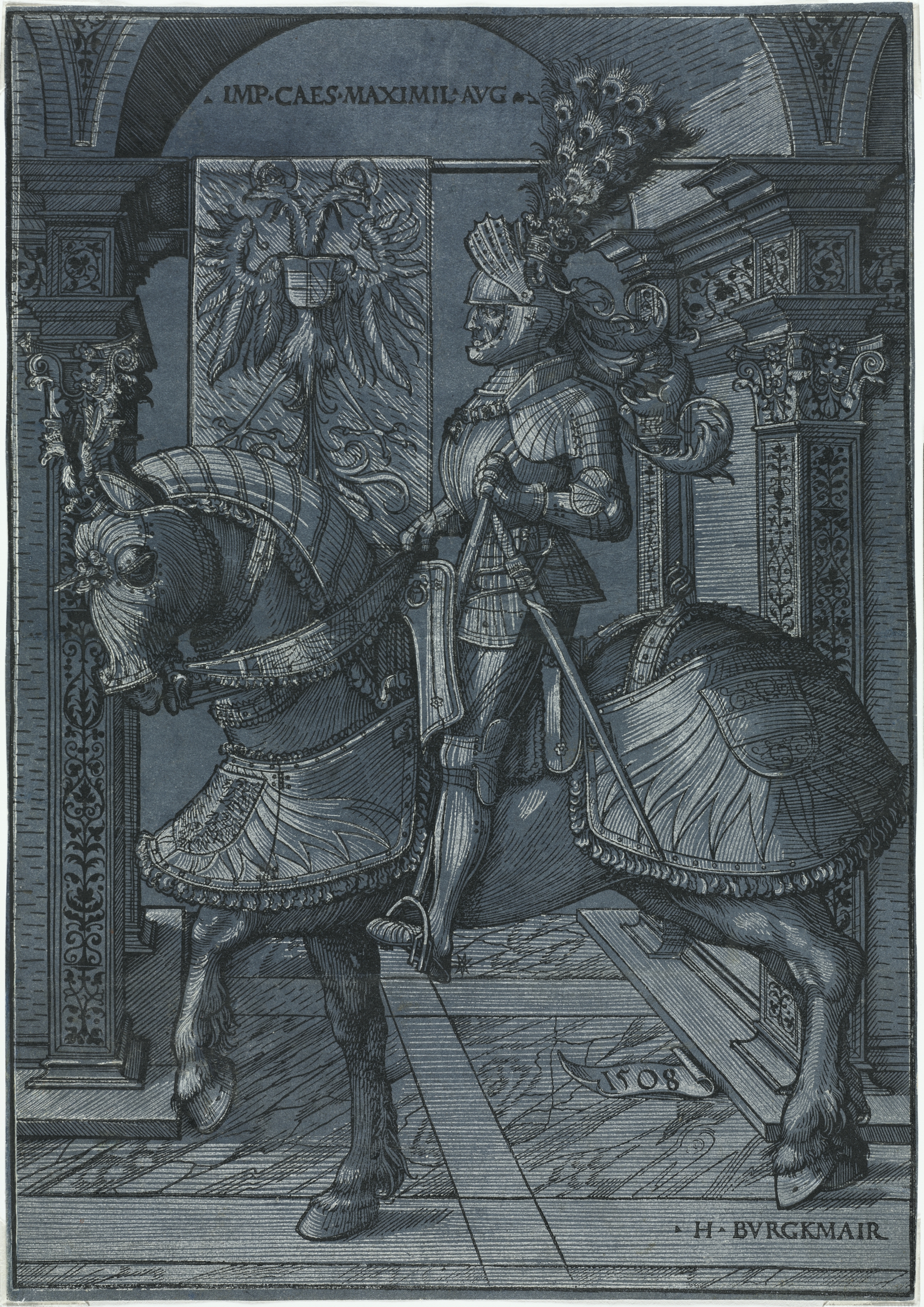 Black and white woodcut image of a man in armor on a horse. The man is wearing a helmet with a feathered crest, plate armor with a large skirt covering the horse. The horse is facing left. The man holds a scepter in his right hand. A decorative wall with carvings surrounds them. An archway is behind them. A carving on the wall shows two figures holding a shield. Text at the top reads "IMP CAES MAXIMIL AVG" and text at the bottom right reads "H BYRCKMAIR". A date "1508" is on a piece of paper on the floor.