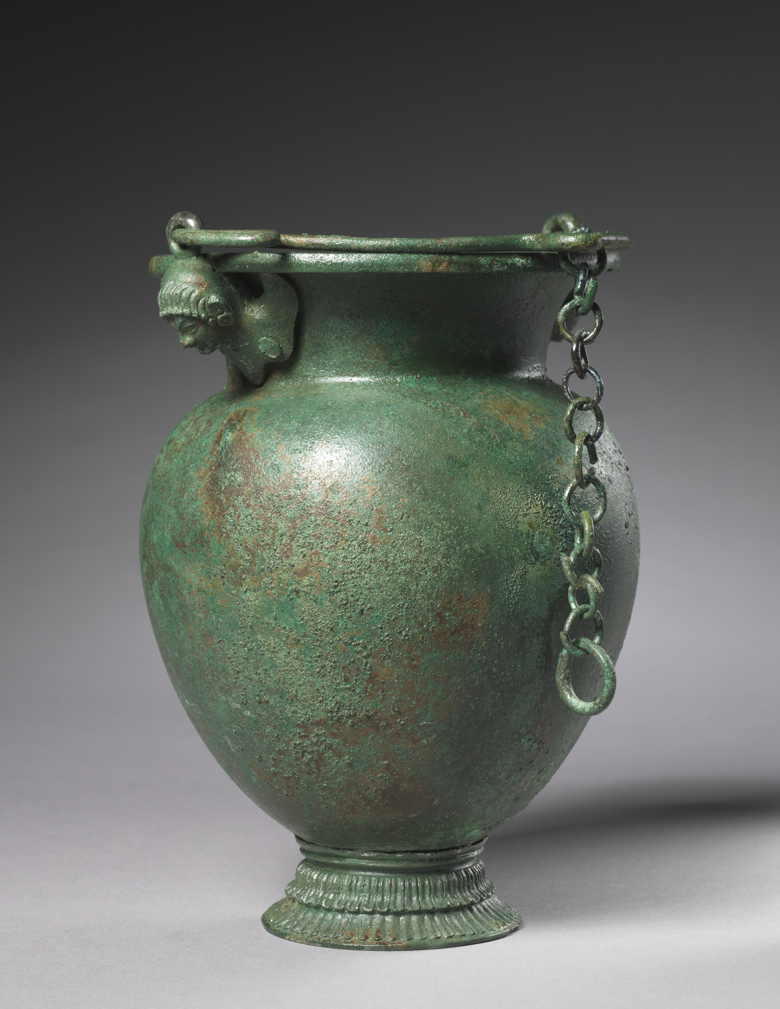 Greenish metal vessel, bulbous body with a narrow neck and flared mouth. A small, decorative human head on the left side, below a metal rod across top, another metal loop on the right side. A metal chain hangs from the right side. The base has ridged decoration. Title: Situla.