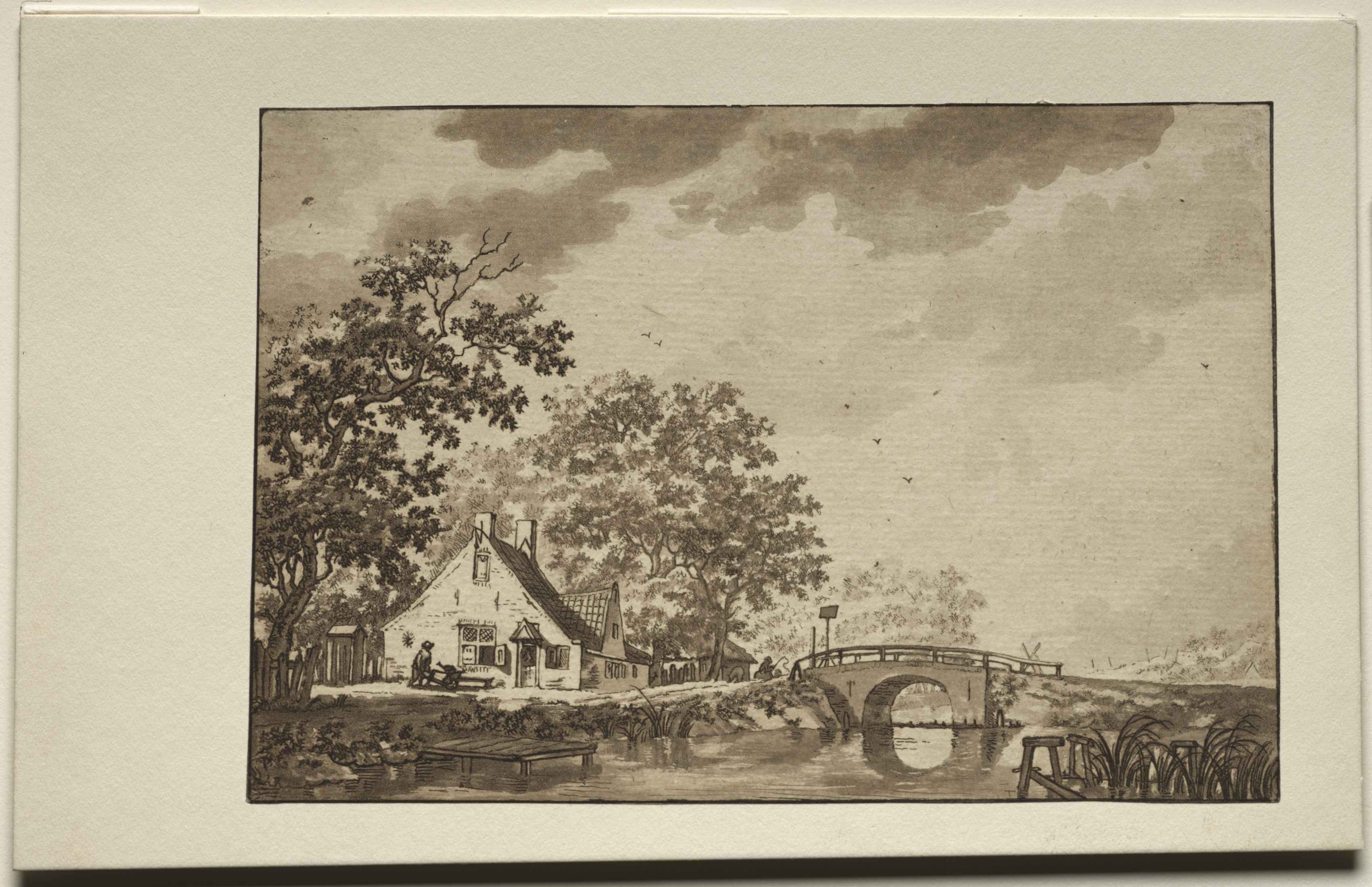 The image depicts a landscape with a cottage and bridge. A small white cottage with a brown roof and two chimneys sits on the left side, next to a large tree. A man stands beside a cart. A bridge with a single arch spans a body of water in front of the cottage, on the right. The bridge has a railing. Water and grass are in the foreground. Dark clouds are in the sky. The image is monochromatic and appears to be an old print.