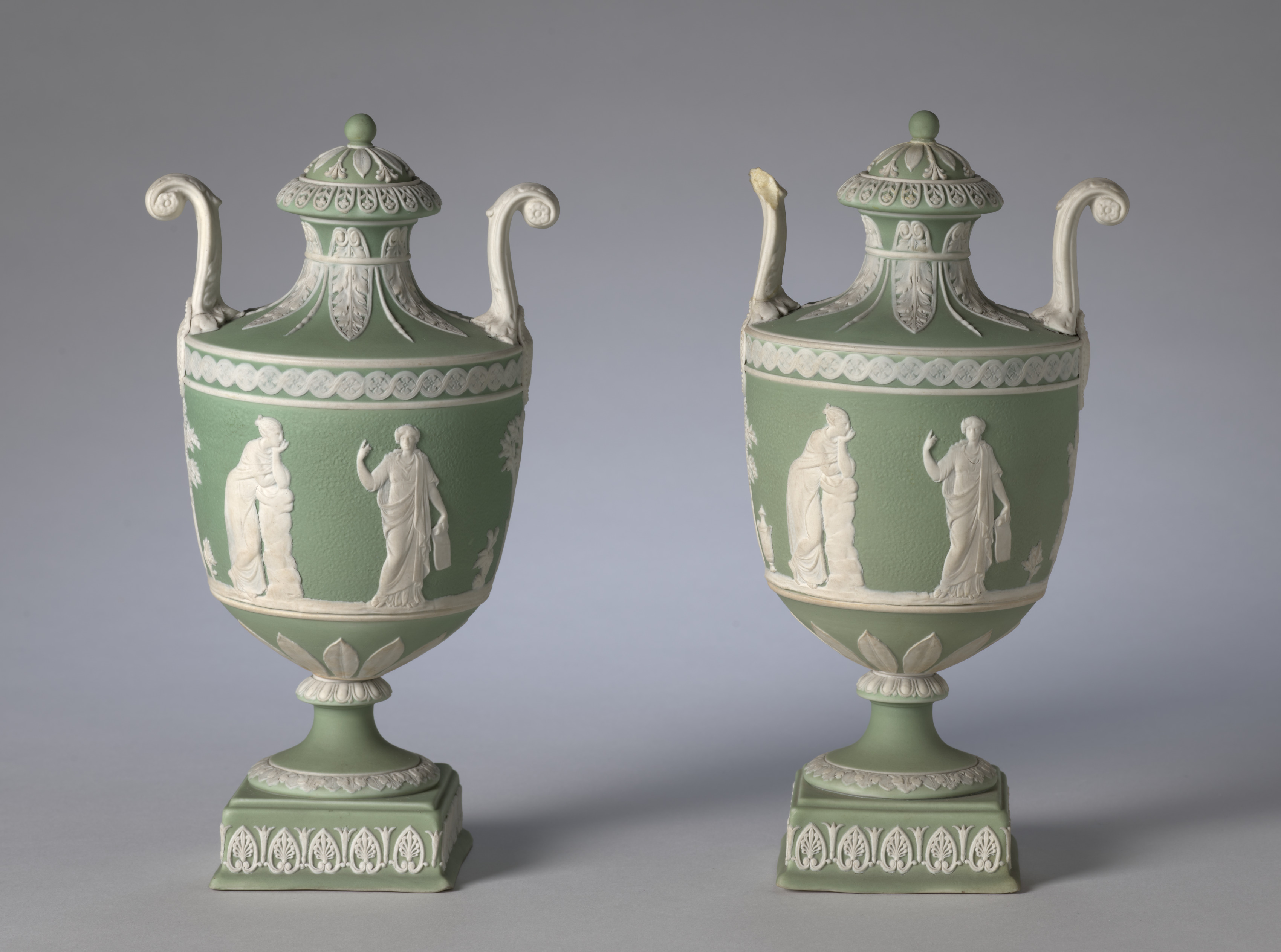 Pair of green and white covered urns with handles on both sides. The urns have a wide body that tapers to a narrower base. A decorative band encircles the top and bottom. The lids are domed with a small finial on top. White reliefs depict people on the urns. The base of each urn is square. The background is gray. The urns are by Wedgwood Factory.