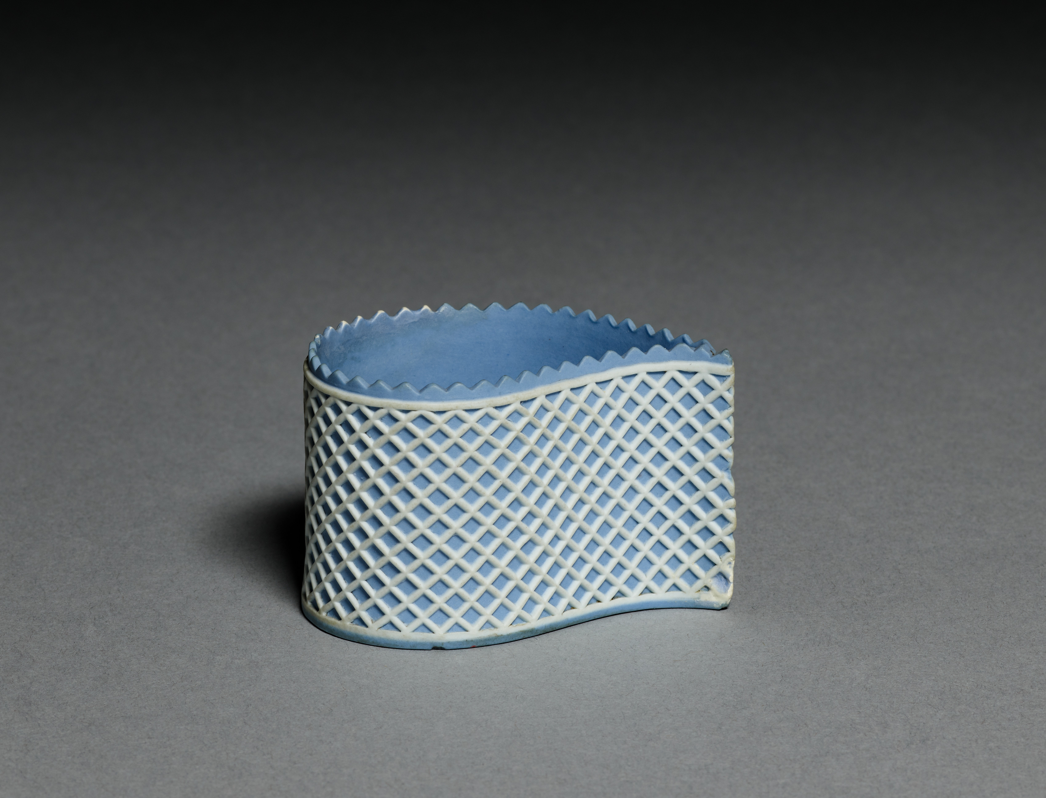 The object is a short, wide ceramic cup. The cup has a blue interior and exterior. The exterior is covered in a white lattice pattern made up of crisscrossing lines. The top edge of the cup has a series of small triangular spikes. The cup's shape is slightly irregular, with a wavy bottom edge. The background is a dark gray surface. The cup is positioned centrally in the image and casts a shadow to the left. The color of the exterior is primarily blue with white accents. The object is titled "Custard Cup" and is by "Wedgwood Factory".