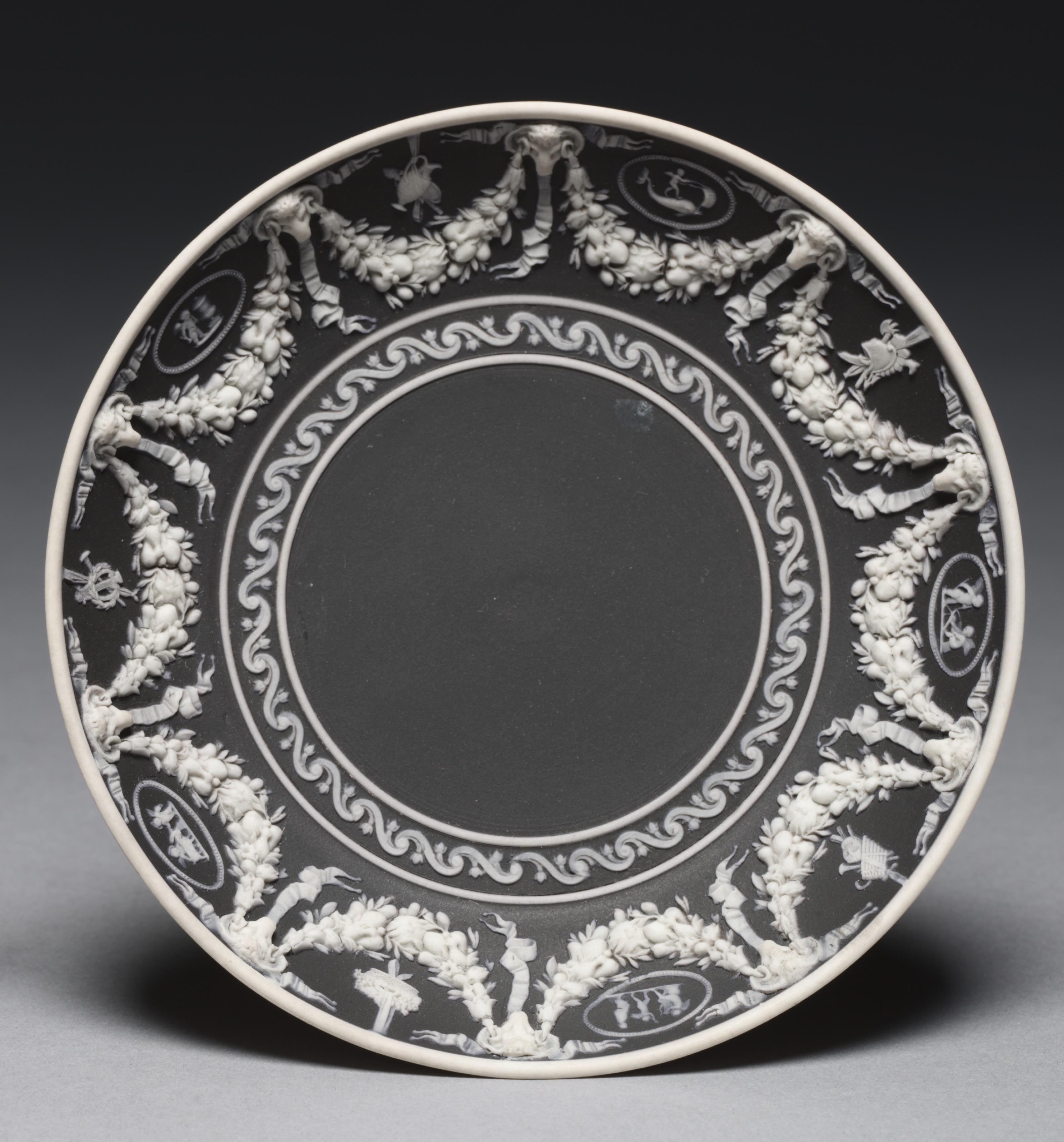 Black and white ceramic saucer with white rim. The center is solid black with a white border made of two concentric circles and a scroll design between them. The outer rim features a repeating pattern of white cameo-style oval medallions containing figurative scenes, alternating with bundles of tied sticks adorned with ribbons and flowers. The background is gray with a darker upper portion and lighter lower portion.