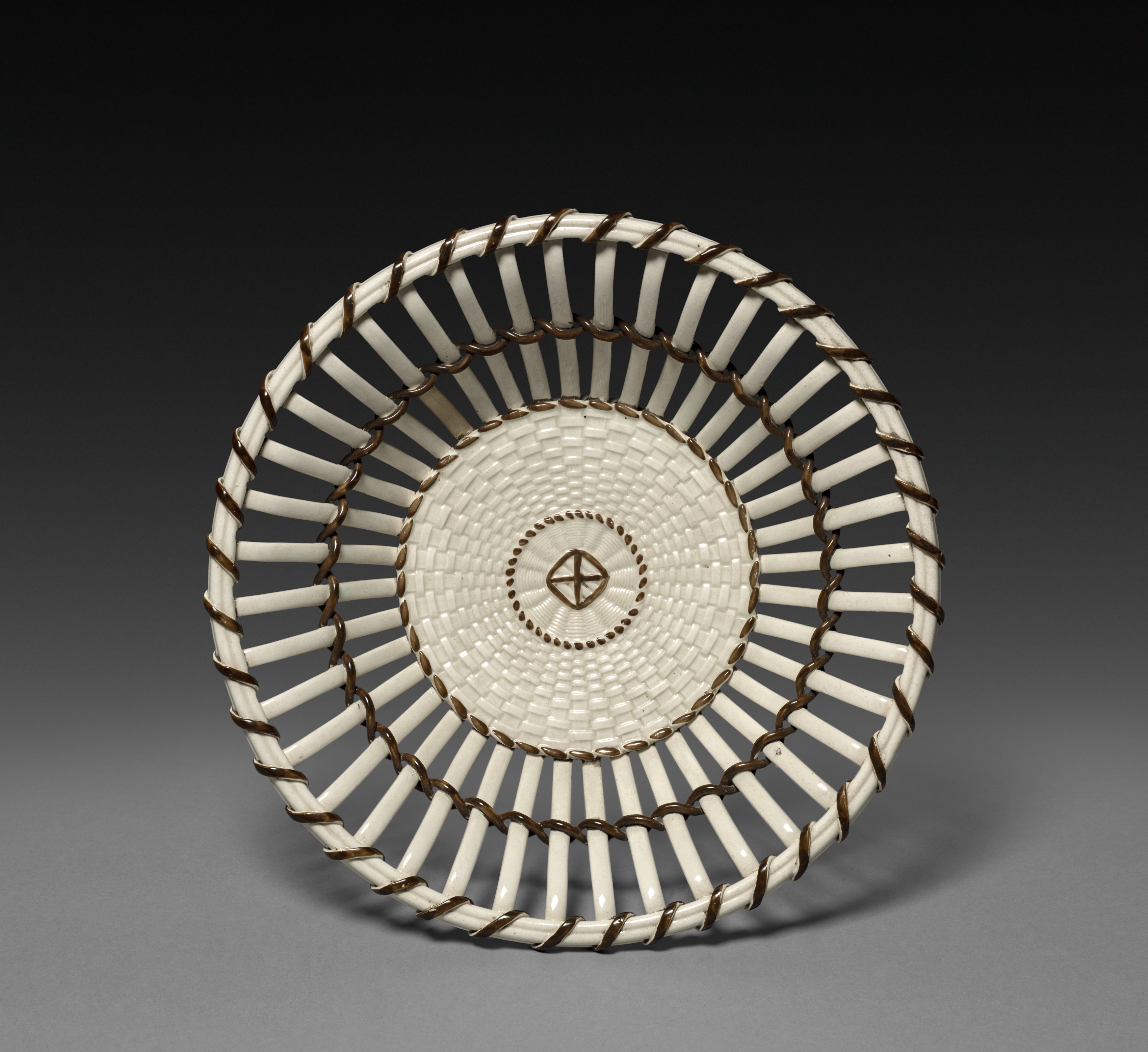 White ceramic bowl with brown accents by Wedgwood Factory. The bowl is round and has a wide mouth. The interior and exterior have a pattern of raised white lines. The lines are separated by and wrapped with brown material. The lines on the exterior are thicker and more prominent than on the interior. The interior has a concentric circle pattern in the center. The center circle is white with a brown design. The background of the image is dark gray, fading to black at the top. The bowl casts a shadow on the surface below it.