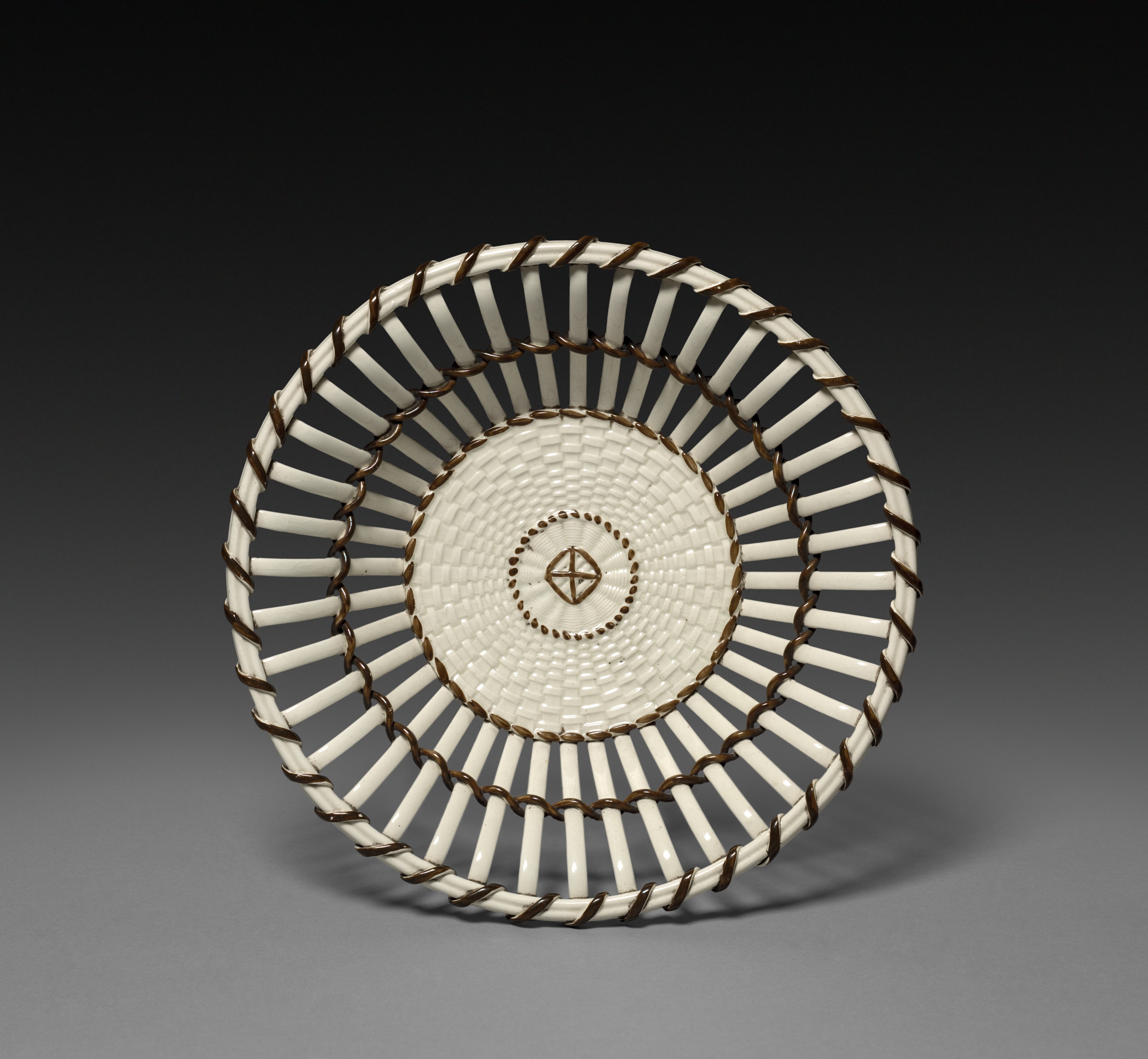 White bowl with brown accents. Round bowl. Wide circular pattern on inside and outside. Circular pattern on inside of bowl made of small white squares. A circle of small brown dots around a brown four-pronged shape in center. Circles of white elongated rectangles separated by brown connected loops around center. Loops have twisted rope-like appearance. Wide lip with white elongated rectangles separated by brown connected loops. Gray and black background. Object casting a shadow.