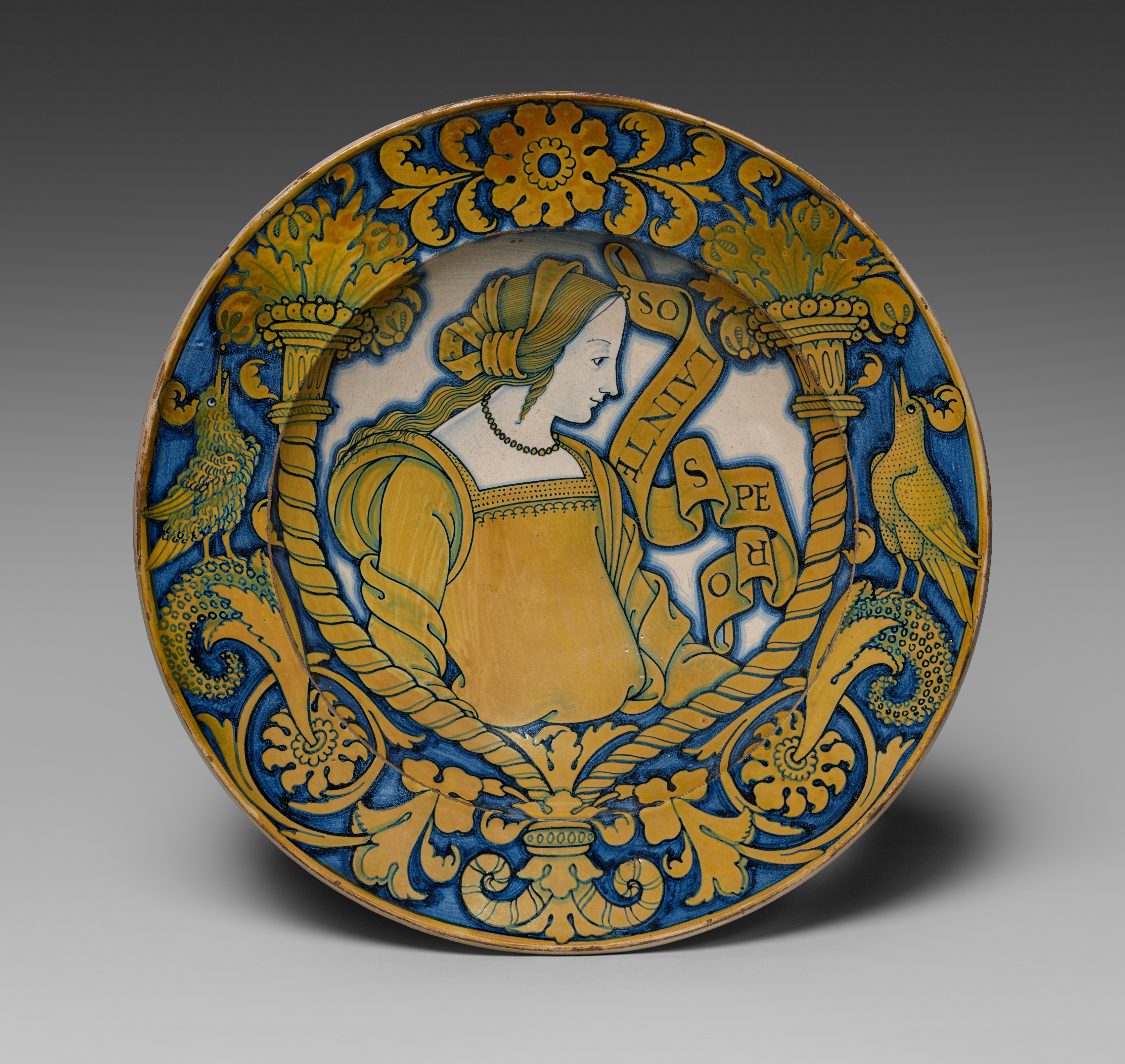 The plate has a gold rim and is decorated with blue and gold designs throughout. A gold rope-like design encircles a woman wearing a gold dress and head covering. The woman's head is turned to the right and she wears a necklace. A banner across her chest reads "S. L. A. I. N. S. P. E. O. H." Two birds stand on either side of her. The plate's border features gold floral designs on a blue background. The plate is set against a gray gradient background. The Plate, by artist Unknown.