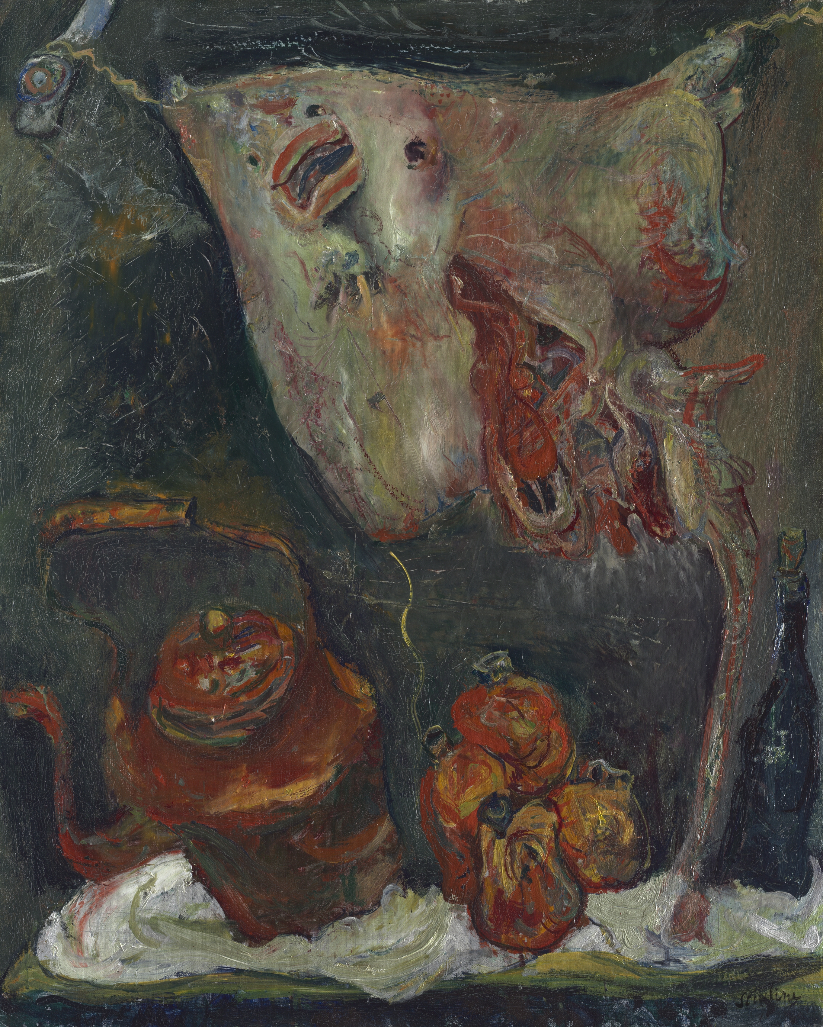 The painting depicts a still life with a large fish, likely a rayfish, and some fruit. The fish is positioned on top, predominantly pale with shades of red, blue, and green. Its mouth is open, and its body appears distorted. Below the fish, on the left, is a brown teapot with a handle on the left side and a spout on the right. To the right of the teapot are two orange fruits stacked on top of each other. The objects are placed on a white cloth. The background is dark, predominantly shades of green, brown, and black. The overall style is expressionist with heavy brushstrokes and vivid colors.